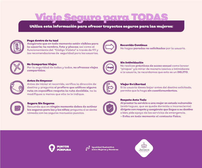 La implementación de los Puntos Púrpura como una de las medidas de seguridad para combatir la violencia de género en el Área Metropolitana de Guadalajara (AMG) encontró en diferentes complejos los espacios de reunión estratégicos para que ellas puedan acudir en caso de sentirse en riesgo.Con el objeto de “prevenir el acoso callejero y la violencia sexual comunitaria para las mujeres, adolescentes y niñas que transitan y residen en el Área Metropolitana de Guadalajara”, el Gobierno de Jalisco en conjunto con el Instituto Nacional de las Mujeres (INMUJERES) y otras dependencias gubernamentales anunciaron el inicio de este proyecto desde junio de 2021, en el que compartieron que este estaría dividido en seis tipos de “Acciones” que continúan hasta hoy:Con esta acción se capacitó y sensibilizó en materia de perspectiva de género, prevención de violencias, masculinidades alternativas a las personas conductoras de servicios de taxi tanto de plataforma como amarillos con el objetivo de prevenir y erradicar la violencia sexual comunitaria contra las usuarias que los aborden.Al igual que la anterior, se capacitó y sensibilizó al personal de los establecimientos ubicados en los polígonos identificados, con el objetivo que se conviertan en personas agentes de cambio y aliadas.Cabe resaltar que el pasado 29 de septiembre, el edificio del Instituto Jalisciense para la Vivienda (Ijalvi), ubicado entre la calle López Cotilla y 8 de julio, se convirtió en un Punto Púrpura, por lo que en caso de sentirte en riesgo podrás resguardarte en este lugar y pedir ayuda.En esta acción se impulsó a los polígonos identificados a ser promotores de la prevención de violencia en sus respectivas colonias mediante intervenciones en materia de perspectiva de género, prevención de las violencias y, especialmente, en la cultura de la denuncia.De la misma manera, se fomentó el autocuidado y las redes de apoyo mediante protocolos que sirvan como herramienta para la prevención de la violencia sexual comunitaria durante la espera, trayecto y descenso de su viaje.Estos espacios esparcidos en diferentes puntos del AMG proveen un lugar seguro de abordaje, con vigilancia, iluminación, tótem con protocolo de seguridad para abordar el vehículo, asientos con puertos USB para cargar batería mientras solicitan y esperan su servicio. A continuación, te compartimos los Tótem (Puntos Púrpura) que puedes ubicar en el AMG:Punto Púrpura en Colón & Nueva GaliciaPunto Púrpura Pedro Moreno & Avenida 8 de JulioPunto Púrpura Miguel Blanco & ColónPunto Púrpura Escorza & Francisco Indalecio MaderoPunto Púrpura Escorza & Pedro MorenoPunto Púrpura José Guadalupe Zuno & Av. Chapultepec Punto Púrpura Pedro Moreno & Robles GilPunto Púrpura Manuel López Cotilla & AtenasPunto Púrpura Morelos & EmersonPunto Púrpura Av. Chapultepec & Av. La PazPunto Púrpura Av. Terranova & Calle José María VigilPunto Púrpura Av. Terranova & Calle FlorenciaPunto Púrpura Av. Rubén Darío & NápolesA través de videovigilancia y patrullaje en los polígonos identificados, así como acciones conjuntas para reaccionar ante alguna alerta por violencia sexual comunitaria al utilizar servicios de plataforma o taxis amarillos.Ahora que sabes lo que son los Puntos Púrpura, ¡aprende a identificarlos! MS