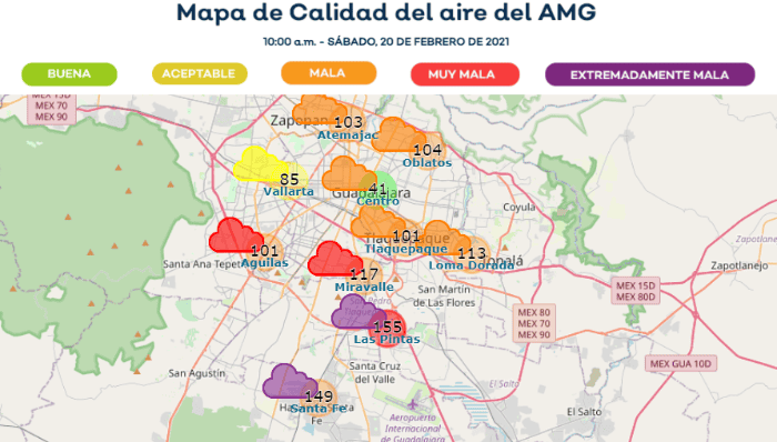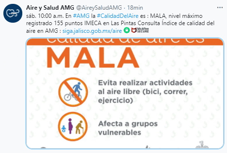 La Secretaría de Medio Ambiente y Desarrollo Territorial (Semadet) activó hoy a las 09:00 horas una contingencia atmosférica fase 1 en la zona de influencia de la estación de monitoreo Las Pintas, en el municipio de El Salto.Lo anterior, debido a que en Las Pintas se registraron niveles mayores a los 150 puntos Imeca (Índice Metropolitano de la Calidad del Aire). A las 09:00 horas se detectaron 153 puntos Imeca y a las 10:00 el nivel máximo fue de 155 puntos.El contaminante registrado son las partículas menores a 10 micras (PM10).Asimismo, continúa la precontingencia atmosférica para la zona de influencia de la estación Santa Fe, en donde se registran 149 puntos Imeca. Ante la mala calidad del aire la Semadet pide a la ciudadanía atender las siguientes recomendaciones:NR