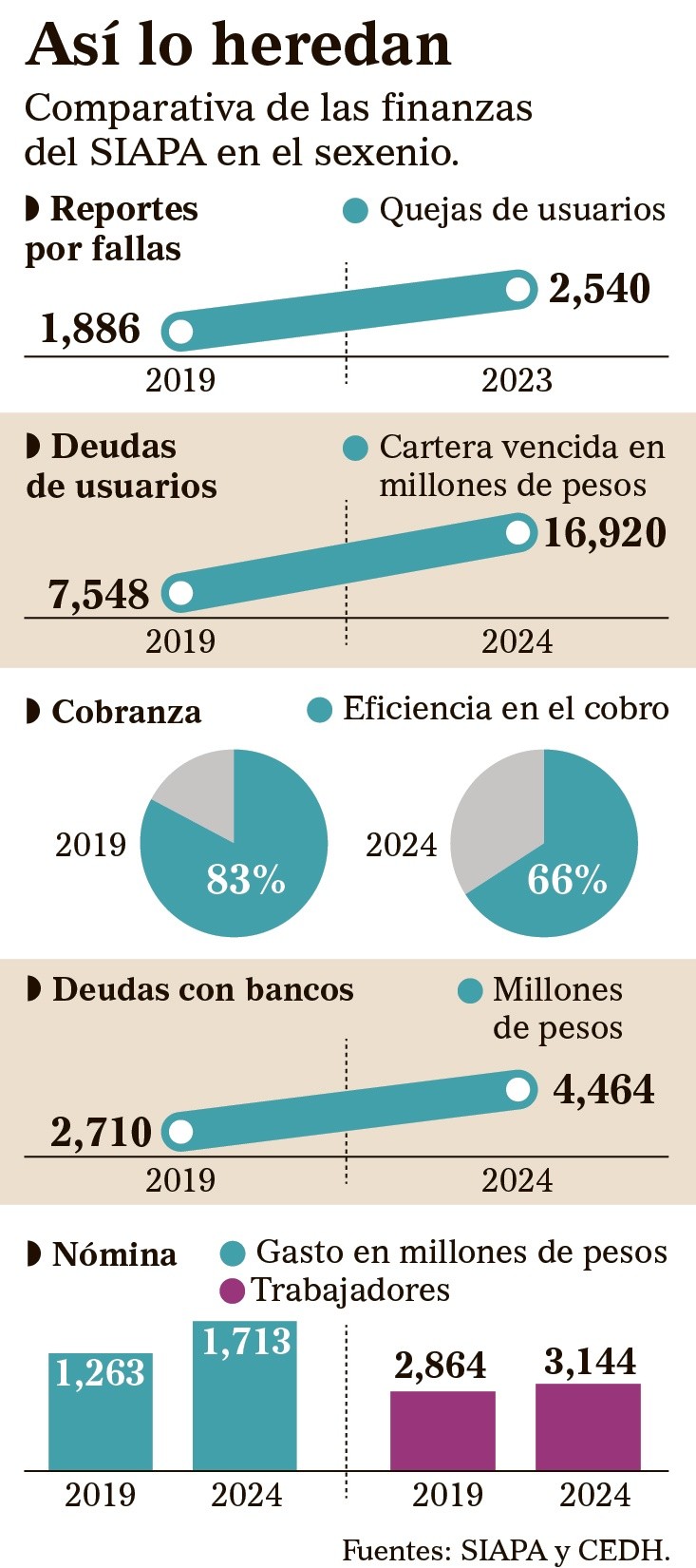 Los cambios en la presente administración del SIAPA no ayudaron a que fuera más eficiente y que bajaran las deudas del organismo.“Debo 24 mil pesos. Dejé de pagar el servicio desde hace varios meses y ahora no tengo dinero para salir del problema. Tendré que acudir al organismo para firmar un convenio de pago”, lamenta Matías Hernández, vecino de la Colonia Tabachines.La cartera vencida de usuarios del SIAPA está en aumento y se ubica en casi 17 mil millones de pesos en este año, una cifra récord de acuerdo con una respuesta del organismo a través de Transparencia. El director del SIAPA, Carlos Torres Lugo, reconoce que al menos la mitad de los adeudos “ya prescribieron o no son cobrables”.Los problemas en la cobranza son un lastre en el sistema. Mientras en 2019 la eficiencia en el cobro era de 83%, disminuyó a 66% en este año. “Hay un rezago en el cobro porque no están monitoreadas ni inventariadas todas las cuentas. Y las que hay, se les carga a los usuarios que pagan más dinero”, acentúa Arturo Gleason, académico de la Universidad de Guadalajara.El gobernador electo, Pablo Lemus, contesta que aplicará una reingeniería para solucionar las problemáticas administrativas, como la cartera vencida. “Vamos a consolidar el Sistema Tributario de Jalisco. Ya no se permitirá que cada dependencia pueda estar cobrando su cartera porque esto se presta a mucha discrecionalidad. Habrá una dependencia que cobrará todas las cuentas del Estado”. Comentó que la escuela de técnicos del SIAPA volverá para tener un sistema profesional y mejorar las finanzas y el servicio.Por otra parte, el pago de la nómina para los trabajadores creció: al iniciar la administración estatal, el SIAPA tenía dos mil 864 empleados de todos los niveles y ahora son tres mil 144. El gasto en la nómina devora una tercera parte del presupuesto anual del sistema intermunicipal. Las quejas contra el servicio también se incrementaron. “El agua sale turbia por el rumbo de Río Nilo, entre José Rubén Moreno y Luis Alfaro. Mi filtro tiene menos de un mes y ya está sucio”, lamentó Rubén Camacho, vecino de esa zona.Las inconformidades de usuarios son por el agua sucia y por el desabasto del líquido: “¿Cuándo regresará a la Colonia Nueva Santa María en Tlaquepaque? No hay daños en las tuberías y tenemos dos semanas sin servicio”, comenta Alejandra Suárez.El número de quejas se disparó a más de dos mil 500 el año pasado, la cifra más alta en todo el sexenio. Por eso la Comisión Estatal de Derechos Humanos (CEDH) emitió una recomendación, con la intención de que se solucionen las fallas.Luis Valdivia, académico de la UdeG, critica que hay un deterioro en el servicio: “Por un lado, en el tema de calidad van varios años, incluso desde la pandemia, que empezó a verse la disminución de la limpieza del agua que llega a la ciudad”.El director Carlos Torres Lugo compareció hace un año ante el Congreso de Jalisco para rendir cuentas sobre el agua turbia y el desabasto en la metrópoli, reconociendo que 20% de la red hidrosanitaria requiere renovarse. Para eso se necesitan ocho mil millones de pesos que no tiene el organismo.“Tenemos más reportes de suciedad de las redes del SIAPA, una eficiencia de cobranza baja y el doble de la cartera vencida. Dejan al organismo con muchas deudas”, indica Josué Daniel Sánchez, especialista en gestión de recursos hídricos. CT