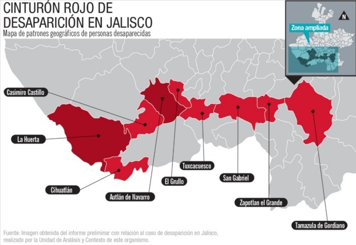 Autlán, La Huerta y Cihuatlán son parte de los nueve municipios que conforman el corredor de la Región Sur con más desaparecidos en Jalisco; en ellos se registran 56, 43 y 41 desaparecidos respectivamente, de acuerdo con el mapa de patrones geográficos de personas desaparecidas, presentado dentro de la Recomendación General sobre el derecho a la protección de todas las personas contra la desaparición forzada y la desaparición cometida por particulares en el Estado de Jalisco, emitida ayer por la Comisión Estatal de Derechos Humanos Jalisco (CEDHJ).El mapa agrupa los datos presentados por el Registro Nacional de Datos de Personas Extraviadas o Desaparecidas (RNPED), que reúne a un total de dos mil 991 personas que hasta el 31 de octubre de 2017 permanecían sin aparecer, y de las cuales 294 fueron vistas por última vez en este corredor, según se señala en dicha recomendación.Con la finalidad de combatir la desaparición de personas en Jalisco, ayer la Comisión Estatal de Derechos Humanos Jalisco (CEDHJ), en compañía de la organización Familias Unidas por Nuestros Desaparecidos en Jalisco (Fundej), dio a conocer la Recomendación General sobre el derecho a la protección de todas las personas contra la desaparición forzada y la desaparición cometida por particulares en el Estado de Jalisco.La recomendación consta de 65 puntos, de los cuales, nueve son recomendaciones de carácter general y 56 de carácter particular, así como 112 acciones específicas y seis peticiones; está dirigida según su competencia a los titulares de los poderes Ejecutivo, Judicial y Legislativo, a las 125 ayuntamientos y de forma específica al fiscal general del Estado, al director del Instituto Jalisciense de Ciencias Forenses, a la Comisión Estatal de atención a Víctimas Jalisco y peticiones a senadores y diputados.Entre los puntos que aborda el documento se encuentra un mecanismo para la creación y activación de alertas que identifique la amenaza a la población e incluya mecanismos de comunicación y respuesta para una búsqueda efectiva de personas desaparecidas; también la instalación de la Comisión Estatal de Búsqueda; la atención y reparación integral de las víctimas de delito y violaciones de derechos humanos y la elaboración de un protocolo especializado para la identificación de personas, cadáveres o restos humanos.Además, se incluyen también cifras que reflejan la situación que guarda actualmente el Estado, entre los que se encuentran diversos mapas que explican la ubicación de fosas clandestinas o la cantidad de personas desaparecidas hasta el 31 de octubre de 2017, como el caso del ‘cinturón rojo’, que muestra la correlación entre los municipios con mayor número de personas desaparecidas en la Región Sur.*De acuerdo con datos del Registro Nacional de Personas Extraviadas o Desaparecidas, del 1 de enero de 2008 al 31 de octubre de 2017