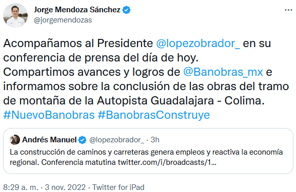El director de Banobras, Jorge Mendoza Sánchez, informó que concluyó la construcción del tramo de la montaña de la Autopista Guadalajara - Colima, con lo cual este viernes entrará en operación.“Mañana entra en operación un tramo de carretera y un tramo de montaña, de la carretera Guadalajara Colima, una deuda que se tenía con los estados de Jalisco y Colima”.En la conferencia de prensa "mañanera" del Presidente Andrés Manuel López Obrador, el director de Banobras dijo que se invirtieron más de 3 mil 278 millones de pesos y con ello se logrará reducir a una hora y media el traslado de Guadalajara a la capital de Colima.Señaló, se espera que la nueva carretera tenga un aforo de 15 mil autos diarios y mejore la conectividad, sobre todo con el puerto de Manzanillo.OA
