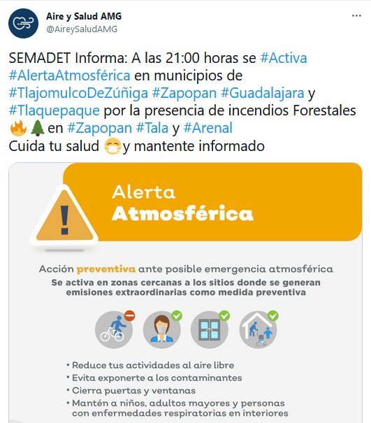 A través de sus redes sociales, la Secretaría de Medio Ambiente y Desarrollo Territorial del Estado de Jalisco (Semadet) informó que investigarán los siete incendios que se registraron la tarde de ayer martes en la ZMG y zonas aledañas "de una manera muy inusual".Según el comunicado emitido por la Semadet, se trata de un hecho extraordinario, pues no se considera normal la dinámica con la que comenzaron dichos incendios.En el último reporte, los incendios forestales registrados y su estatus, son los siguientes:-Cerro de los Bailarines, municipio de El Arenal, activo.-Cerro del Tepopote, municipio de Zapopan, controlado.-Cerro del Colli, municipio de Zapopan, dentro del Área de -Protección de Flora y Fauna (APFF) Bosque La Primavera, activo.-El Poleo, municipio de Tala, dentro del Área de Protección de -Flora y Fauna (APFF) Bosque La Primavera, liquidado.-El Varal, municipio de Ixtlahuacán de los Membrillos, activo.-Rancho Contento, municipio de Zapopan, liquidado.-Bosque del Centinela, municipio de Zapopan, controlado.A causa de esto, la noche del miércoles se activó la Alerta Atmosférica a partir de las 21:00 horas para los municipios de Guadalajara, San Pedro Tlaquepaque, Tlajomulco de Zúñiga y Zapopan.GC