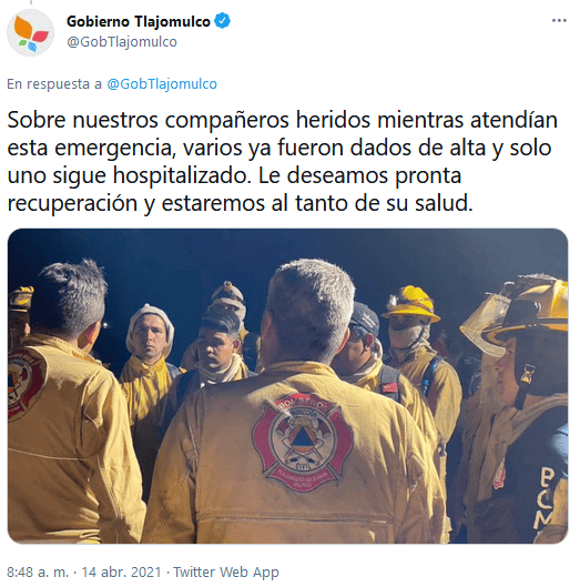 Tras registrarse un nuevo incendio en el paraje Los Volcanes, de El Bosque la Primavera, al menos 15 brigadistas resultaron heridos durante su trabajo para combatir el fuego.Hacia la noche de ayer martes, el director de Bomberos de Tlajomulco, Rodrigo Arellano, informó que de los 15 elementos, ocho fueron trasladados al Centro Médico de Occidente en estado regular, mientras que el resto fueron trasladados a una clínicia del IMSS para que les realizaran curaciones.Ya por la mañana de hoy miércoles, el Gobierno de Tlajomulco informó que sólo un brigadista sigue hospitalizado. "Le deseamos pronta recuperación y estaremos al tanto de su salud", detallaron.Cientos de brigadistas, de Protección Civil y Bomberos de Jalisco, Tlajomulco y Zapopan, la Conafor, CFE, OPD Bosque La Primavera, Junta Intermunicipal de Medio Ambiente para la Gestión Integral de la Región Valles (JIMAV) y Forestal Tlajomulco, continúan combatiendo el fuego que inició desde la tarde de ayer martes en el paraje Los Volcanes, del Bosque La Primavera.Asimismo, solicitaron a todos los ciudadanos no acudir a la torre 1 para realizar actividades deportivas, esto debido a que el humo puede causar problemas respiratorios. Cabe resaltar que la Semadet activó a las 19:00 horas de ayer una Alerta Atmosférica en los municipios de Guadalajara, Tlaquepaque, Tlajomulco y Zapopan, debido al incendio forestal.GC