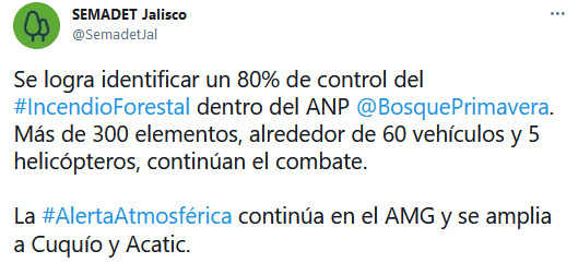 Los Ayuntamientos de Guadalajara, Tlaquepaque y Zapopan anunciaron que fue suspendida La Vía RecreActiva de este domingo 9 de mayo, debido a la alerta atmosférica que se encuentra activa en estos y otros municipios de la Zona Metropolitana de Guadalajara (ZMG), debido al incendio que cientos de bomberos combaten en el Bosque La Primavera. Guadalajara también informó que "las unidades deportivas con control de acceso permanecerán cerradas hasta nuevo aviso".Autoridades pidieron a la ciudadania mantenerse alerta a las recomendaciones que se emitan a través de las cuentas oficiales.La Semadet activó la alerta atmosférica desde la mañana de ayer sábado por el incendio activo en el paraje Ciudad Cajetes, dentro del Bosque La Primavera. En su último informe, se detalló que ya lograron controlar un 80% del incendio; Más de 300 elementos, alrededor de 60 vehículos y cinco helicópteros, siguen combatiendo el fuego.