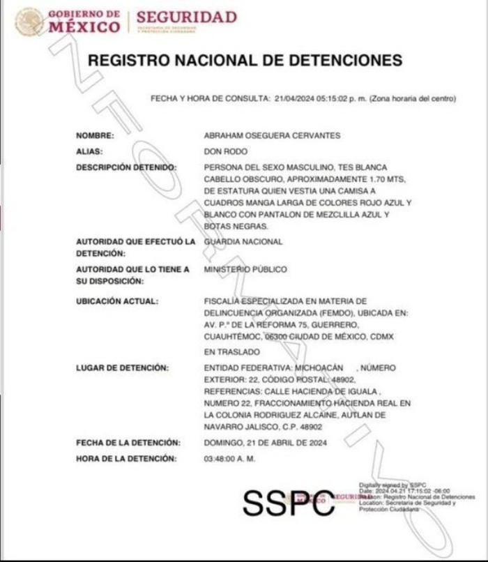 Según el Registro Nacional de detenciones fue aprehendido Abraham Oseguera Cervantes, alias “Don Rodo”, hermano de Nemesio Oseguera, alias “El Mencho”, quien es el actual líder de la organización delictiva conocida como el Cartel Nueva Generación (CNG).La detención se efectuó a las 3:48 horas por la Guardia Nacional (GN) en el fraccionamiento Hacienda Real en Autlán de Navarro, Jalisco, y es trasladado a la Fiscalía Especializada en Materia de Delincuencia Organizada, en la Ciudad de México.Es importante aclarar que si bien la detención se llevó a cabo en el estado de Jalisco y el Registro Nacional de Detenciones señala que fue en Michoacán. EE