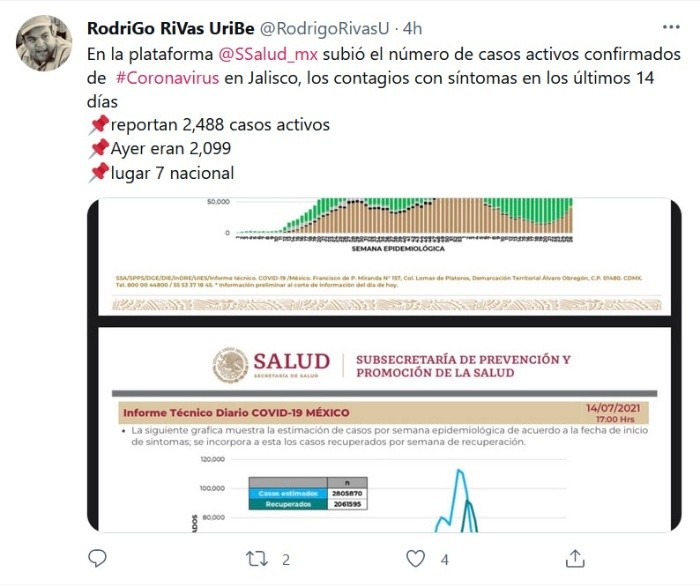 El virus de COVID-19 está muy lejos de dar tregua a Jalisco y por el contrario, en los últimos días los contagios han ido al alza. Tan sólo en las últimas 24 horas, la Secretaría de Salud Jalisco confirmó un total de 813 nuevos pacientes contagiados con esta enfermedad.La cifra no había sido tan alta este año desde febrero pasado, cuando el día 12 de ese mes se reportaron mil 030 casos en un solo día. Un día después la Secretaría daba cuenta de 807 contagios en 24 horas.Con los casos reportados este miércoles Jalisco acumula un total de 259 mil 579 enfermos con el virus en nuestro estado, lo cual equivale a llenar casi cinco veces el Estadio Jalisco.Respecto de las muertes reportadas por la dependencia estatal, este día se dio cuenta de 13 decesos, con los que se llega a un total de 12 mil 694 fallecimientos asociados al virus.En cuanto a las personas hospitalizadas el reporte de este día informó de 371 pacientes internados en nosocomios públicos y privados de Jalisco a causa del coronavirus, cifra que se traduce en un promedio de 15 pacientes internados cada hora.El número de hospitalizados no se veía a tal magnitud desde el pasado 7 de abril, cuando la dependencia estatal reportó 391 personas internadas en los distintos nosocomios de Jalisco.Por último, respecto de los casos activos, es decir personas contagiadas con el virus que han manifestado síntomas en los últimos 14 días, este miércoles la Secretaría de Salud Federal estimó un total de dos mil 488 casos, número tres veces más alto que los pacientes reportados a inicios de este mes, cuando el 1 de julio se contabilizaban apenas 725 casos activos.JM