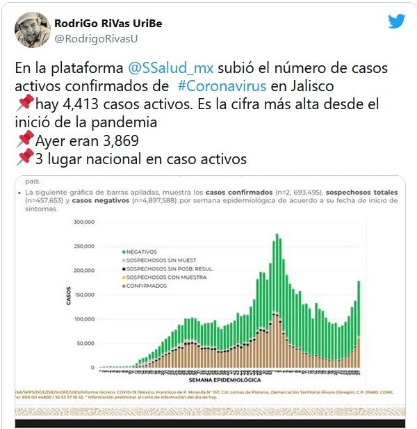 Este miércoles la Secretaría de Salud Jalisco informó que en las últimas 24 horas se reportaron mil 275 contagios de COVID-19, colocándose así como el día con más casos nuevos desde febrero pasado.El día con más contagios antes de este miércoles fue el sábado 06 de febrero, cuando se reportaron mil 551 casos en un solo día.Con los casos reportados este día Jalisco acumula un total de 266 mil 948 enfermos con el virus en nuestro Estado.Respecto de las muertes reportadas por la dependencia estatal, este día se dio cuenta de seis decesos, con los que se llega a un total de 12 mil 757 fallecimientos asociados al virus.En cuanto a las personas hospitalizadas el reporte de este día informó de 640 pacientes internados en nosocomios públicos y privados de la Entidad a causa del coronavirus, cifra que se traduce en un promedio de 26 pacientes internados cada hora.Además, este miércoles la Secretaría de Salud Federal informó que en Jalisco hasta el último corte se habían reportado un total de cuatro mil 413 casos activos, es decir, pacientes que presentaron síntomas en los últimos 14 días, colocándose como el día con la cifra más alta de casos activos desde el inicio de la pandemia.El día previo con más casos activos fue el pasado 16 de julio, con tres mil 428 casos.Con esta cifra, Jalisco se ubica en el tercer puesto a nivel nacional con más casos activos, sólo por debajo del Estado de México (ocho mil 451 casos) y la Ciudad de México (con 29 mil 495 casos activos).El 21 de enero de este año ha sido el día el día con más casos confirmados en toda la pandemia, con un total de mil 900 contagios reportados por Salud Jalisco en 24 horas.Si te interesó esta noticia y quieres saber más, entonces descarga y descubre INFORMAPlus, la aplicación digital de EL INFORMADOR, en donde tenemos contenidos exclusivos, seleccionados por nuestros editores, para darles una experiencia más completa a los lectores.Descarga la aplicación y pruébala GRATIS por treinta días.Para iOS: https://apple.co/35jaVgbPara Android: https://bit.ly/3gwVSEVJM