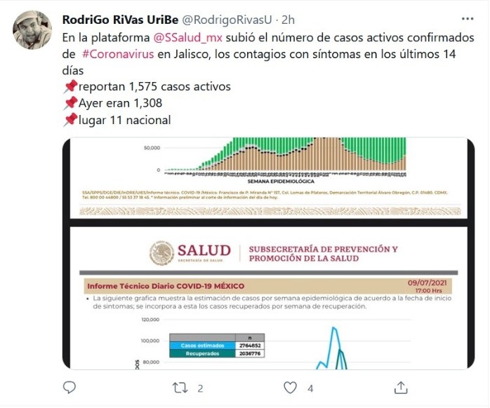 El número de casos activos de COVID-19 en Jalisco se duplicó en la última semana y pasó de 780 a mil 575 notificados en el comunicado técnico de la Secretaría de Salud Federal, los casos activos corresponden a las personas que han presentado síntomas de la enfermedad en los últimos 14 días. Jalisco es parte de las entidades federativas que contribuyen al repunte de contagios registrado a nivel nacional.También van en aumento el número de hospitalizados por el virus, este viernes se reportan 235 personas atendidas en hospitales públicos y 33 en nosocomios privados. Hace una semana había 157 hospitalizados.Según el más reciente reporte de la Secretaría de Salud Jalisco, en instalaciones del Instituto Mexicano del Seguro Social (IMSS) se atiende a 157 pacientes, 45 en hospitales estatales, 30 en los Hospitales Civiles de Guadalajara y tres en el Instituto de Seguridad y Servicios Sociales de los Trabajadores del Estado (ISSSTE). En la plataforma federal sobre ocupación hospitalaria, aparecen nueve hospitales de Jalisco con cien por ciento de ocupación en las camas generales habilitadas para pacientes COVID; aunque no se precisa cuántas camas hay por institución. En el reporte de camas con ventilador en Unidades de Cuidados Intensivos, donde atienden a los pacientes más graves, tienen ocupación total el Hospital General Regional 110 del IMSS y el Hospital Comunitario de El Grullo.En su informe diario la Secretaría de Salud federal confirmó cuatro muertes más provocadas por el virus en el estado, con esto suman 12 mil 653 fallecimientos desde que inició la contingencia sanitaria.JM