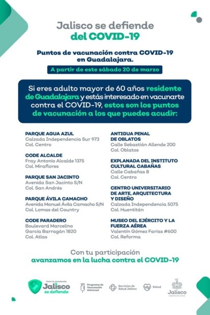 Esta mañana la Secretaría de Salud Jalisco dio a conocer los nueve puntos donde se aplicará la vacuna contra COVID-19 a adultos mayores residentes del municipio de Guadalajara.Será a partir del próximo sábado 20 de marzo, de 8:00 am a 4:00 pm (o hasta que se terminen las dosis) cuando las y los adultos mayores de Guadalajara puedan acudir a alguno de los siguientes puntos: Pese a que ayer martes el delegado Estatal de Programas Para el Desarrollo de Jalisco, Armando Zazueta Hernández, indicó que la vacunación se llevaría a cabo conforme al orden alfabético del primer apellido de los adultos mayores, la Secretaría de Salud Jalisco informó que esto no será así, y que se recibirá a las personas conforme lleguen, como ha ocurrido en el resto de los municipios.El delegado manifestó que se contemplan 80 mil 925 vacunas para Guadalajara, haciendo hincapié que sólo serán para residentes de la capital tapatía. Quienes acudan deberán hacerlo con comprobante de domicilio y su credencial para votar del INE como identificación pues de ahí se obtendrá también su CURP.Por último, Zazueta Hernández hizo un llamado a la ciudadanía a mantener el orden y la paciencia, recordando que el compromiso del Presidente, Andrés Manuel López Obrador (AMLO) es que todos los adultos mayores sean vacunados. “Habrá vacunas para todos y estamos en la ruta de cumplir con esta meta”, dijo.GC