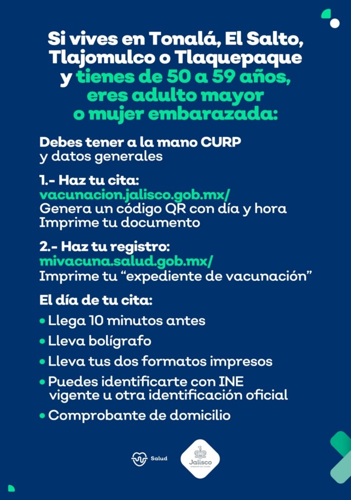 Tlaquepaque se integrará a los municipios de El Salto, Tonalá y Tlajomulco cuyos habitantes de 50 años en adelante así como mujeres embarazadas podrán acudir a recibir la primera dosis de la vacuna contra el COVID-19.La jornada de vacunación para estos grupos iniciará el próximo lunes 31 de mayo. Para las personas de 50 a 59 años la aplicación será en el macro módulo ubicado en el Auditorio Benito Juárez y en el caso de las mujeres mayores de edad con más de nueve semanas de gestación, estas deberán presentarse en el macro módulo habilitado en el Museo del Ejército y Fuerza Aérea en Guadalajara.La aplicación que desarrollará bajo el modelo estatal de vacunación, que consiste en la generación de citas y horarios preestablecidos, con lo cual se espera una jornada ágil.Las personas interesadas deberán registrar su cita en el portal https://vacunacion.jalisco.gob.mx/, así como en el portal federal de https://mivacuna.salud.gob.mx/index.php para garantizar su vacuna.Para recibir orientación sobre el proceso de registro se puede llamar a la línea telefónica 33 3823 3220, con un horario de lunes a domingo de 8:00 de la mañana a 8:00 de la noche.Hasta el corte del día de ayer, Jalisco acumula 249 mil 848 casos confirmados, así como un total de 12 mil 233 defunciones por COVID-19.Ante casos sospechosos se puede llamar al número 33 3823 3220 de la Secretaría de Salud Jalisco o a la línea 33 3540 3001 de la Universidad de Guadalajara, donde se dará orientación y/o cita para la prueba gratuita en alguno de los centros de toma de muestra.La autoridad recuerda que la pandemia sigue activa y por tanto se deben seguir las medidas sanitarias vigentes, como usar cubrebocas adecuadamente, permanecer por corto tiempo en espacios públicos, mantener distancia de 1.5 metros entre personas, y lavarse frecuentemente las manos con agua y jabón o usar gel alcoholado al 70 por ciento.Si se presentan síntomas como tos persistente, dificultad respiratoria, fiebre que no cede o la oxigenación en sangre disminuye a menos de 92 debe acudir a una unidad de urgencias y no esperar una prueba confirmatoria de COVID-19.NR