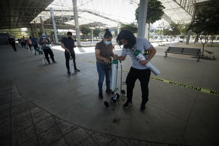 En coordinación con el ayuntamiento de Guadalajara, su Unidad de Protección Civil y la comisaría tapatía, “Oxígeno Sobre Ruedas” ha logrado llevar oxígeno a alrededor de 300 familias, desde que comenzó a operar “de manera ambulante” el pasado 24 de enero, ante la escasez del producto en las distintas tiendas que lo comercializan.Todos los días comparten la ubicación y el horario de recarga en sus redes sociales. Media hora antes de su llegada personal del ayuntamiento de Guadalajara ordenan a las personas para que tomen su debida distancia, además de que les regalan caretas de protección mientras esperan su turno, el cual es asignado por medio de tarjetas que entregan los encargados de “Oxígeno en Ruedas”.Los acompañan también elementos de la Unidad de Protección Civil y Bomberos del municipio para verificar que no existan riesgos durante las recargas y que los tanques a rellenar estén en buen estado y que cumplan con las disposiciones que garanticen que estos son de uso médico, mientras que la comisaría vigila los alrededores para resguardar la seguridad de los asistentes que buscan rellenar sus tanques.El vehículo en el que viajan lleva en su interior los tanques que surten a los más pequeños, cuya capacidad alcanza para rellenar entre 60 a 65 tanques portátiles de 425 litros y 682 litros por día, con un costo de 250 pesos por recarga, explicó Marco Díaz, quien forma parte de Oxígeno en Ruedas. Aunque por ahora visitan solo un punto por día, ya analizan la posibilidad de establecer al menos dos puntos de recarga diarios, añadió.“Esperemos que no nos suban a nosotros el oxígeno para poder seguir ofreciendo las recargas a ese precio, porque nosotros también tenemos que recargar. A nivel federal no hemos hablado sobre alguna regulación, pero Cofepris Jalisco fe quien nos dio el visto bueno para poder trabajar, sin ellos y sin Protección Civil, no podríamos estar haciendo esto”, añadió Díaz.El director de la Unidad de Protección Civil y Bomberos Guadalajara, Felipe López Sahagún, indicó que los puntos donde se realizarán las recargas se eligen de acuerdo al espacio en el cual pueda ordenarse a las personas sin exponerlas a riesgos de contagios de coronavirus, que la recarga no represente un peligro para las zonas habitacionales, que esté bien ventilado y que no reciba la luz directa del sol, por lo cual, la semana pasada las recargas se hacían solo de noche.Sin embargo, este lunes, dijo, se generaron las condiciones para que la recarga se hiciera en el Parque San Jacinto, a las 14:00 horas. Ahí, al menos una hora antes de la llegada del oxígeno ya había alrededor de 20 personas formadas en espera de un turno.Una de esas personas era Francisco, quien tenía desde las 6:00 am buscando oxígeno para su papá, quien hace dos semanas fue diagnosticado con coronavirus. Los negocios que visitó, dijo, no tenían el producto, pero en redes sociales supo que “Oxígeno en Ruedas” llegaría este lunes al parque San Jacinto, en Guadalajara.Gastó al menos 300 pesos en taxis en busca de recargar el tanque de 425 litros que su familia rentó el viernes por dos mil pesos a la semana, pero a las 10:30 de la mañana ya estaba en espera del oxígeno. Fue el primero en llegar, y ahí esperó a que llegara el negocio móvil aún con duda de que fuera una broma. El pequeño tanque, contó, le dura a su papá alrededor de seis horas corridas, “pero se lo ponemos por ratitos de media hora en lo que le levanta la respiración y se refuerza con un concentrador que le conseguimos para que el oxígeno le dure”, dijo.Jonathan Pulido por su parte llegó al parque alrededor de las 11:00 horas, fue el segundo en formarse. Él acudió con un tanque de 682 litros que usualmente llena su familia para que su abuelito pueda seguir respirando, pues debido a un padecimiento de sus pulmones debe usar el oxígenos de por vida ya que estos solo trabajan al 40%. Sin embargo, debido a la escasez se ha complicado llenarlo de manera habitual, por lo que, Oxígeno en Ruedas no solo representa una esperanza para las familias que tienen pacientes con complicaciones por COVID-19, sino también a quienes lo requieren permanentemente.LS