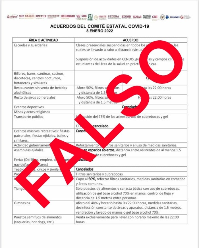En redes sociales, WhatsApp y otras plataformas, está circulando información falsa de nuevos acuerdos de restricciones sanitarias en Jalisco por la pandemia de COVID-19, alertó este domingo el gobernador.La circular apócrifa trae un membrete de varias instituciones federales, cámaras empresariales, menos el logo actual del Gobierno de Jalisco, aparentemente comenzó a circular desde el 8 de enero de 2022.“Otra vez está circulando información falsa. No se dejen engañar. No hay nuevas medidas programadas en Jalisco. Será mañana, en la mesa de salud, cuando se analizará el tema. No caigamos en las mentiras mal intencionadas”, comentó el ejecutivo estatal en su página de Facebook.Será el lunes 10 de enero que la Mesa de Salud, del Gobierno de Jalisco, se reúna para determinar nuevas medidas por la pandemia de coronavirus.Según Radar Jalisco, ayer se registraron mil 812 nuevos casos de COVID, además de cinco defunciones, que acumulan en total 17 mil 664 muertes en el estado desde marzo 2020.IM