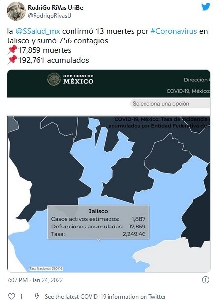 Con tres mil 832 casos confirmados por el sistema Radar Jalisco en las últimas 24 horas, el Estado sumó un récord más de contagios de COVID-19 notificados en el reporte diario. El acumulado total llegó a 454 mil 917 personas afectadas por el virus en los casi dos años de contingencia sanitaria. El número de hospitalizaciones también sigue en aumento, en la base de datos de la Secretaría de Salud Jalisco (SSJ) se da cuenta de 714 personas atendidas en hospitales públicos y 35 en nosocomios privados.En el ámbito público, la mayor demanda se registra en instalaciones del Instituto Mexicano del Seguro Social (IMSS) con 444 pacientes; hay 123 en hospitales de la SSJ; en los Hospitales Civiles de Guadalajara 97; mientras que en el Instituto de Seguridad y Servicios Sociales para los Trabajadores del Estado (ISSSTE) son 50.Tras la ampliación de camas COVID habilitadas, la ocupación hospitalaria se ubicó en 46.42% de los mil 538 espacios disponibles.En las últimas 24 horas se confirmaron 13 muertes, en lo que va del mes han sido notificados 227 defunciones por el virus y desde comienzo de la pandemia suman 17 mil 859 fallecimientos.JM
