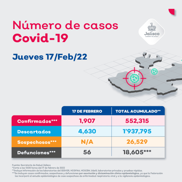 Esta noche de este jueves el sistema Radar Jalisco de detección activa COVID-19 reportó 56 muertes diarias por el virus esto quiere decir 64 menos que el récord de fallecimientos en Jalisco que fue el 8 de enero de 2021 donde se reportaron 120 defunciones máximo desde que comenzó la pandemia.Además se reportaron un mil 907 casos activos diarios, la curva sigue descendiendo en comparación a la punta de la cuarta ola donde el 3 de febrero hubo 5 mil 908 contagios, el porcentaje que se ha disminuido es de 32.27%.El acumulado de la pandemia de infectados en Jalisco es de 552 mil 315 y desde que comenzó la crisis sanitaria en la entidad van 18 mil 605 muertes.En todo lo que va del año 2022 la fecha en la que hubo más decesos por el virus SARS-CoV-2 fue el 9 de febrero con 67 muertes.La ocupación hospitalaria en Jalisco reportó 542 pacientes internados por Coronavirus en hospitales públicos, ayer eran 561 hospitalizados; y se reportaron 55 hospitalizaciones en nosocomios privados, el miércoles eran 56.MF