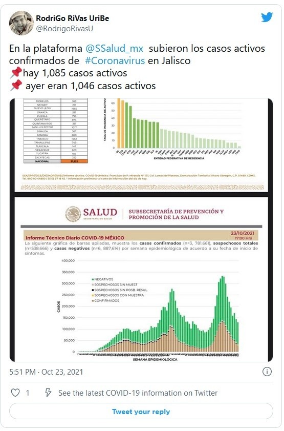 Con un promedio de 34 fallecimientos confirmados al día, en lo que va del mes de octubre se han notificado 792 víctimas del COVID-19 en Jalisco, cifra superior a la registrada en octubre del 2020 cuando hubo 768, según los reportes de la Secretaría de Salud Federal.El informe técnico diario de la dependencia federal da cuenta este sábado de 49 decesos más, confirmados en las últimas 24 horas, el acumulado llegó a 16 mil 778 muertes desde el inicio de la contingencia sanitaria en marzo del año pasado.En el desglose por municipios, Guadalajara tiene la mayor letalidad con 5 mil 712 fallecidos; Zapopan 2 mil 471; Tlaquepaque mil 229; Tonalá 807; Tlajomulco 786 y Puerto Vallarta 785.La hipertensión es la principal comorbilidad, 51.31% de los fallecidos por el virus tenían presión alta y el 40.21% padecían diabetes.El registro de hospitalizaciones da cuenta de 400 pacientes atendidos en hospitales públicos y 52 en instituciones privadas. La demanda de atención en nosocomios ha bajado, hace un mes había 756 hospitalizados.Respecto al número de casos activos, que representa a las personas que han manifestados síntomas de la enfermedad en los últimos 14 días, Jalisco es el octavo lugar nacional con 1,085 contagios activos confirmados, 39 más que ayer.JM