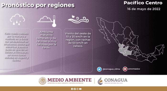 Para este lunes habrá ambiente caluroso en la mayor parte del país y temperaturas mayores a 45 grados en 5 estados, y para el Estado de Jalisco de hasta 40 grados, de acuerdo con el pronóstico del tiempo de la Comisión Nacional del Agua.Según la dependencia, un sistema anticiclónico en niveles medios de la atmósfera mantendrá el ambiente de caluroso a muy caluroso en la mayor parte de la República Mexicana.Señala que será extremadamente caluroso en el noreste y suroeste de Chihuahua, noreste de Coahuila, norte de Nuevo León, norte de Sinaloa, y este y sur de Sonora, entidades en las que se esperan temperaturas superiores a 45 grados Celsius.Mientras, en Campeche, Guerrero, Michoacán, Morelos, Oaxaca y Tamaulipas se prevén valores de 40 a 45 grados Celsius.Asimismo, se pronostican temperaturas máximas de 35 a 40 grados Celsius en el norte, Baja California, Baja California Sur, Chiapas, Colima, Durango, suroeste del Estado de México, Guanajuato, Hidalgo, Jalisco, Nayarit, norte y suroeste de Puebla, Querétaro, Quintana Roo, San Luis Potosí, Tabasco, Veracruz, Yucatán y en el norte y sur de Zacatecas, y de 30 a 35 grados Celsius en Aguascalientes, la Ciudad de México y Tlaxcala.Por lo anterior, se recomienda a la población tomar medidas preventivas como evitar la exposición prolongada a la radiación del sol, hidratarse adecuadamente, poner especial atención a enfermos crónicos, niños y adultos mayores, así como atender las indicaciones de las autoridades del sector Salud y de Protección Civil.Lluvias puntuales fuertes (de 25 a 50 milímetros [mm]) se esperan en el sur de Chiapas; intervalos de chubascos (de 5 a 25 mm) en zonas de Campeche, Chihuahua, Durango, Guerrero, Jalisco, Michoacán, Oaxaca y Quintana Roo, y lluvias aisladas (de 0.1 a 5 mm) en Colima, Estado de México, Nayarit, Yucatán y Zacatecas. Las precipitaciones podrían acompañarse de descargas eléctricas y posibles granizadas.Por otra parte, se estima que habrá vientos fuertes con rachas de 60 a 70 kilómetros por hora (km/h) y tolvaneras en regiones de Chihuahua, Coahuila, Durango. Nuevo León y Tamaulipas, y de 50 a 60 km/h: Baja California, Baja California Sur, Jalisco, Zacatecas, San Luis Potosí, Aguascalientes, Guanajuato y Puebla.Las lluvias, vientos y tolvaneras serán generados por una línea seca que permanecerá sobre el norte del territorio nacional, canales de baja presión extendidos sobre diferentes regiones del país y la entrada de humedad proveniente de ambos océanos.OA