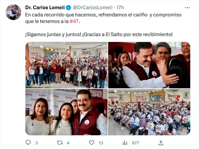 En su visita a El Salto, el Presidente del Consejo Estatal de Morena Carlos Lomelí lamentó que autoridades estatales no tomen acciones para solucionar la contaminación de ríos y mejorar la atención médica en el municipio.Habitantes de El Salto se reunieron en una asamblea informativa que encabezó Carlos Lomelí Bolaños, quien demandó la falta de atención de las actuales autoridades estatales para El Salto.Al respecto, Lomelí desmintió que exista una limpieza y saneamiento del río Santiago, tal como la ha expresado el gobernador ante instancias internacionales, y señaló que aun existen muchos ríos contaminados que ocasionan enfermedades renales en la población, como sucede en El Salto y Poncitlán.Asimismo, demandó mejorar la red y el abasto de agua en este municipio metropolitano, esto ante las inumerables quejas que han hecho los habitantes.En este encuentro que se realizó en la colonia Las Pintas, Lomelí Bolaños reiteró que Morena es el único conducto para que a Jalisco llegue la justicia social y la Cuarta Transformación, y eso se puede hacer realidad en 2024 con el apoyo del pueblo."Llevemos un mensaje de esperanza: un mensaje de cambio y de transformación". Finalmente, vaticinó que pronto llegará a Jalisco un gobierno que obedezca al pueblo, como se los han enseñado en el movimiento transformador.La visita de Carlos Lomelí fue a invitación de los consejeros estatales del Distrito 20 de Morena, Cuauhtémoc Rentería y Diana Rivera, detalla un comunicado.JM