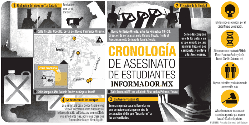 Los tres estudiantes de cine desaparecidos desde el pasado 19 de marzo en Tonalá fueron asesinados por miembros del cártel Nueva Generación, presuntamente, por disputas que mantenían con el cártel Nueva Plaza, informó la Fiscalía General del Estado.De acuerdo con las investigaciones, los jóvenes grababan un video en una finca conocida como “La Cabaña”, la cual cuenta con un amplio antecedente criminal y ha sido vinculada a la célula opositora a Nueva Generación.La Fiscalía explicó que los jóvenes utilizaban dicha finca debido a que había sido prestada por la tía de uno de ellos, quien se dijo propietaria de la misma durante las indagaciones, y quien actualmente se encuentra bajo prisión preventiva por lenocinio.Sin embargo, la dependencia señaló que el inmueble, utilizado como casa de seguridad del cártel antagónico era propiedad de Diego Mejía, detenido en la finca en 2015, junto con cinco personas más, ligadas a Nueva Plaza, liderado por “El Cholo”.Por este motivo, y según explicó la Fiscalía, los jóvenes habían sido privados de la libertad debido a que los integrantes de Nueva Generación buscaban obtener información sobre la organización contrincante y el paradero de Diego Mejía.Según las investigaciones, los jóvenes fueron privados de la libertad sobre Periférico Oriente, a la altura del Fraccionamiento colinas de Tonalá, para posteriormente llevarlos a una finca en la calle Lechuza 8991, en la colonia Pinar de Las Palomas, en Tonalá, donde los habían tenido en cautiverio para interrogarlos y torturarlos. Liz Torres, jefa de las investigaciones, explicó que fue en este punto donde habrían sido asesinados, el mismo día de la privación de la libertad de acuerdo con indicios genéticos.Luego de esto, según precisó Torres, los jóvenes habrían sido llevados a una tercera finca, ubicada en el número 450 de la calle Amapola de la colonia Prados de Coyula, también en Tonalá, misma que según la Fiscalía era utilizada para la disolución de cadáveres, pues en ella fueron hallados 46 bidones, ácido sulfúrico y tres tinacos con dicha sustancia, utilizada comúnmente para la disolución de cadáveres. “Por estos hallazgos se presume que ahí pudieron ser diluidos los cuerpos”.Sin embargo, también se informó que los indicios genéticos recabados durante el proceso de investigación sólo corresponden al ADN de Marco Francisco Ávalos y Jesús Daniel Díaz y hasta ahora no se ha obtenido material que pueda ser relacionado al perfil genético de Salomón Aceves.Por el caso de los estudiantes, de los cuales no se encontró que tuvieran algún vínculo con el crimen organizado, la Fiscalía identificó a ocho participantes, de los cuales dos ya fueron detenidos y vinculados a proceso (Gerardo “N” y Omar “N”), mientras que “El Canzón”, quien vivía en la finca donde los estudiantes fueron torturados, fue asesinado el 2 de abril, en Guadalajara. Según informó la jefa de investigaciones, aún se cuenta con seis órdenes de aprehensión.De acuerdo con las investigaciones de la Fiscalía por la desaparición de los tres estudiantes del CAAV, sólo han sido localizados indicios que corresponden a perfiles genéticos de Marco y Daniel.Según la coordinadora de Laboratorio de Genética del Instituto Jalisciense de Ciencias Forenses, Karina Hernández, fueron recibidas cerca de 100 muestras, de las que ya fueron analizadas 67 que dieron como resultado 20 perfiles; de éstos sólo dos coinciden con el ADN de Marco Ávalos y Jesús Díaz.La funcionaria aclaró que no quiere decir que el resto del material corresponda a otras tantas víctimas, sino que pudieron ser parte de muestras que dejaron otras personas. Agregó que es posible que del resto de muestras aún pueda localizarse algún perfil que corresponda a Javier Salomón Gastélum, aunque “no es una certeza que del material biológico, como se dieron las circunstancias sea posible encontrarlos (...) los indicios como dicen, no tienen palabra”.