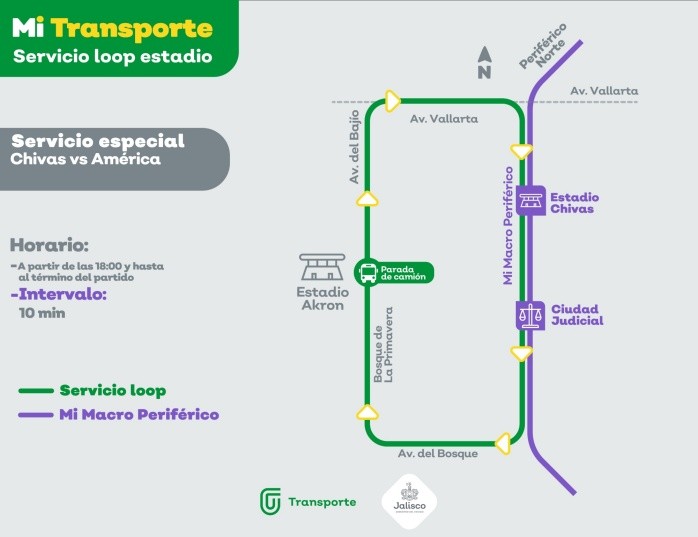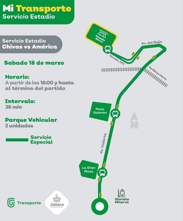 El Clásico Nacional está a la vuelta de la esquina y si tu eres de los afortunados que ya tiene boleto en mano para asistir al Estadio Akron el próximo sábado, no olvides que habrá servicio especial de transporte público por si deseas dejar tu vehículo y viajar en transporte público.El duelo entre Chivas y América genera mucha pasión entre sus aficionados, por lo que sin duda alguna habrá un lleno en la casa rojiblanca, y ante eso, es que la Secretaría de Transporte, en coordinación con la administración del Estadio Akron y transportistas, dispondrá un servicio especial para facilitar el arribo y la salida de los aficionados.Será a partir de las 18:00 horas y hasta el término del partido entre los clubes más populares de México que habrá un circuito de una ruta alimentadora que conectarán al inmueble con estaciones de Mi Macro Periférico –Estadio Chivas, Ciudad Judicial y Ciudad Granja–, y una ruta más que circulará desde la Glorieta Minerva hasta dicho estadio, con recorrido sobre la Avenida Vallarta, luego por avenida del Bajío y continuando por el Circuito JVC.Para el servicio que se ofrecerá entre el Estadio Akron y las estaciones de Mi Macro Periférico, se contará con 6 unidades con intervalos de 10 minutos y en el caso de la ruta que partirá desde la Glorieta Minerva serán dos unidades con intervalos de aproximadamente 38 minutos, aunque los tiempos de recorrido pueden variar de acuerdo a las condiciones del tráfico.Para el cierre se colocarán unidades de contra demanda y se ampliarán frecuencias en la troncal de Mi Macro Periférico, que igualmente ofrecerá el servicio hasta las 23:45 horas.Algo que sin duda llama la atención es que en este servicio especial los usuarios también podrán beneficiarse con los descuentos en el transbordo, pues con la tarjeta Mi Movilidad sólo pagarán un 50% del costo del pasaje al abordar una alimentadora; igualmente de regreso pagarán un pasaje completo al abordar la alimentadora en el Estadio y al subirse a Mi Macro Periférico pagarán únicamente la mitad.Y para evitar confusiones entre los aficionados que vayan a hacer uso de este servicio especial del transporte público se instalará señalética provisional para orientar a los usuarios a ubicar paradas oficiales de las rutas, así como los lugares autorizados para los taxis amarillos y, por separado, el servicio de plataformas.Previo, durante y después del partido, el área de Supervisión al Transporte Público vigilará que el servicio se ofrezca de la mejor manera, tanto en el colectivo como en taxis y plataformas y que éstos últimos levanten y dejen usuarios únicamente en los sitios permitidos.