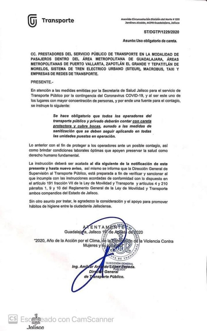 Aunque los choferes de transporte público acatan la medida obligatoria del uso de cubrebocas por la contingencia de COVID-19, no así la recién impuesta por la Secretaría de Transporte (Setran) sobre contar también con careta, pese a que ya pasaron cinco meses desde que se notificó el primer caso de la enfermedad en Jalisco.Algunos, como Gerardo de la ruta T08, señalaron que hace dos semanas ya les habían dicho de la medida e incluso les dieron caretas, sin embargo no las usan porque, según argumentaron les obstruyen la visión.“Los compañeros dijeron que no los dejan ver a los lados, yo ni la usé, pero tampoco nos han dicho nada sobre que es obligatoria, no sé si de ahora en adelante sí”, dijo.Pero otros, como Gilberto Jiménez Godoy, también de la ruta T08, no sabe cuándo será obligatorio o si les darán.“Oí comentarios, pero no sé cuándo nos las piensan dar. Sí es bueno el uso de caretas, aparte de los cubrebocas. Supuestamente algunos ya la traen, pero a nosotros no sabemos cuándo piensan darlas, ni han dicho para qué fecha será obligatoria”, señaló.O como Francisco Villalobos, de la 123-V, quien explicó que la empresa para la que trabaja solo les dió cubrebocas y no les ha informado sobre las caretas.Mientras tanto, la Setran circuló un comunicado el 19 de agosto en el que se mencionaba que, a partir de este jueves, la medida sería obligatoria para todos los operadores de transporte público dentro de la Zona Metropolitana de Guadalajara (ZMG), Área Metropolitanas de Puerto Vallarta, Zapotlán el Grande y Tepatitlán de Morelos.Pero también para operadores del Sistema de Tren Eléctrico Urbano (Siteur), taxi y empresas de redes de transporte, “con el fin de proteger a los operadores de un posible contagio”.La secretaría también informó que el miércoles se hizo entrega gratuita de mil 500 caretas como estímulo. Además que “cumplirán la función de reforzar las medidas de prevención” y “responden al acuerdo emitido por el gobernador que contempla las medidas necesarias para prevenir contagios”.NR