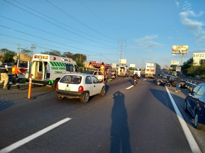 Esta mañana ocurrió un choque entre dos vehículos particulares en la autopista a Zapotlanejo, a la altura de la antigua caseta del municipio de Tonalá, en sentido a Guadalajara.El choque se debió a un alcance. En el automóvil marca Athos viajaban cinco personas. Un hombre y dos mujeres (una de ellas en gestación), y dos menores de edad. En el automóvil marca Vento solo viajaba el conductor.Tras el incidente servicios médicos de Tonalá y paramédicos de la operadora de la autopista llegaron a atender a los lesionados.El saldo es dos menores de edad que se reportan con un estado de leve a regular, una mujer que reporta lesiones leves y otra mujer que quedó prensada y pudo ser liberada por los servicios médicos.En cuanto al conductor que iba solo, refirió dolor en sus extremidades inferiores. NR