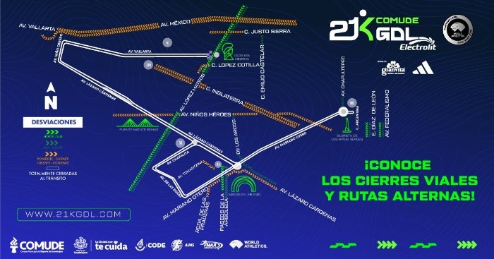 Habrá cierres viales en la Perla Tapatía el próximo domingo 23 de febrero con motivo del Medio Maratón Guadalajara Electrolit 2025, el cual iniciará en los Arcos Vallarta y recorrerá importantes avenidas como: Vallarta, Niño Obrero, Lázaro Cárdenas, entre otras.La carrera está estructurada para comenzar con los paratletas a las 6:20 de la mañana, seguido por los atletas de élite y clasificados a las 6:30 AM, y al final, los corredores convencionales saldrán a las 6:35 AM. Aunque hasta el corte de esta nota no se ha revelado a qué hora comenzarán los cierres viales, se prevé que inicien horas antes del comienzo del maratón. También puedes seguir los cierres viales y las rutas alternas directamente en el mapa de la aplicación de Waze, o haciendo clic aquí. La meta será también en los Arcos Vallarta, siendo el tiempo máximo oficial para finalizar la carrera a las 10:30 horas.El Medio Maratón Guadalajara Electrolit 2025 fue reconocido con la etiqueta Platino de World Athletics, por lo que esta carrera es la primera en América Latina en lograrlo.NA