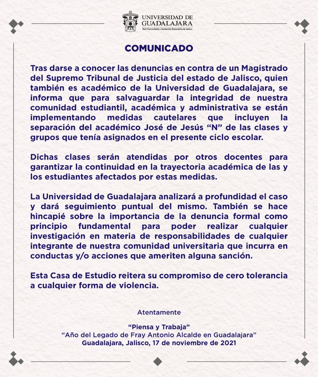 En las redes sociales circula un video donde se ve al magistrado del Supremo Tribunal de Justicia del Estado de Jalisco, “José de Jesús “N”, abusando de una menor de edad, quien es su sobrina. Esto después de que se dieran a conocer las denuncias por abuso sexual en agravio de la menor en su contra.En el material se puede ver a José de Jesús "N" entrar a la cocina donde se encontraba la joven de 15 años, al parecer, lavando trastes. Éste la abraza por atrás, le comienza a besar el cuello y le toca los senos.El video que dura al rededor de 30 segundos, finaliza cuando la joven se desafana del magistrado y se va.Integrantes del Colegio Nacional de Juristas, así como el padre de la menor de 15 años hicieron público el señalamiento en contra del magistrado por los hechos ocurridos en marzo pasado durante un evento familiar, según refirieron los denunciantes.Tras las denuncias, la Universidad de Guadalajara (UdeG) informó que José de Jesús "N" fue separado de la casa de estudios donde también ejercía como académico “a fin de salvaguardar la integridad de la comunidad estudiantil, académica y administrativa”.Las clases que fueron retiradas a José de Jesús “N” serán atendidas por otros docentes para garantizar la continuidad de la formación académica de las y los estudiantes afectados por estas medidas, aseguró la Universidad.El presidente del Supremo Tribunal de Justicia del Estado de Jalisco, Daniel Espinosa Licón, refirió que el magistrado José de Jesús "N" solicitó licencia al cargo tras las acusaciones de abuso en su contra.A la 13 horas de este jueves el Tribunal sesionará para dar cuenta del tema y determinar si le inician procedimiento contra el magistrado.Sobre el tema diputados del PRI presentaron un punto de acuerdo para que el Poder Legislativo solicite el retiro del cargo del magistrado.JB