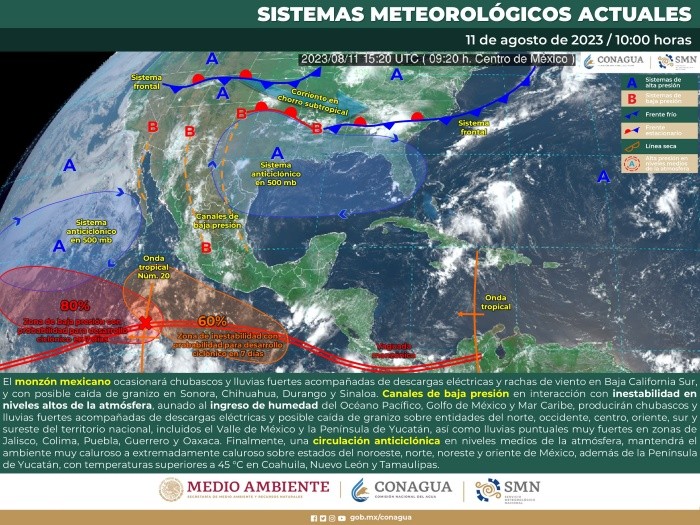 El Servicio Meteorológico Nacional (SMN) ha anunciado que la nueva onda tropical número 22 se aproximará a la península de Yucatán este fin de semana ocasionando fuertes lluvias tanto en la península como en el sureste de México.Asimismo debido a una circulación anticiclónica en niveles medios de la atmósfera que se ubica en el sur de Estados Unidos y el norte del Golfo de México, se generará un ambiente de muy caluroso a extremadamente caluroso en noroeste, norte, noreste y oriente de México.Debido a la Onda Tropical 22, se espera la presencia de lluvias fuertes con puntuales muy fuertes, así como posibles tolvaneras. En cuanto a la temperatura se espera una máxima de 35 a 40°C.Habrá intervalos de chubascos con lluvias puntuales fuertes, posibles tolvaneras y continuará el ambiente caluroso con temperaturas máximas de 35 a 40°C.Todas las lluvias tienen pronóstico de estar acompañadas de descargas eléctricas y fuertes rachas de viento, además se corre el riesgo de un incremento en los niveles de ríos y arroyos, deslaves e inundaciones en zonas bajas del estado.YC