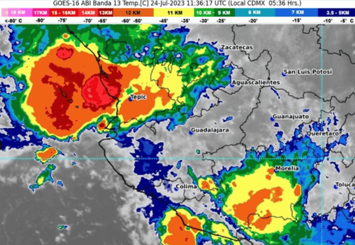 Los últimos 10 días, el Área Metropolitana de Guadalajara ha sido afectada por lluvias intensas que ya cobraron la primera víctima mortal, y el pronóstico dice que las tormentas continuarán, además de ser acompañadas de actividad eléctrica. Aquí los detalles de la previsión elaborada por el Servicio Meteorológico Nacional (SMN).En entidades del noroeste, occidente y sureste de México, se pronostican chubascos y lluvias fuertes con descargas eléctricas en las próximas horas:Cielo medio nublado a nublado durante el día, con probabilidad de lluvias al amanecer en zonas de Michoacán, Jalisco y Nayarit. Por la tarde, lluvias puntuales muy fuertes en Nayarit, Jalisco, Colima y Michoacán, las cuales podrían incrementar los niveles de ríos y arroyos, y generar deslaves e inundaciones. Ambiente fresco durante la mañana y caluroso por la tarde. Viento de componente oeste de 15 a 30 km/h con rachas de 50 a 70 km/h y posibles tolvaneras en Jalisco.Con información del Servicio Meteorológico NacionalOA