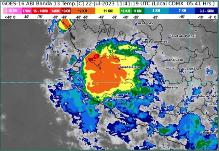 El pronóstico del clima para Jalisco y el Área Metropolitana de Guadalajara para este sábado establece que las lluvias seguirán y serán fuertes. Además, las precipitaciones pueden ir acompañadas de viento, granizo y actividad eléctrica, de acuerdo a la previsión del Servicio Meteorológico Nacional (SMN), por lo que aquí te compartimos más detalles:El SMN informó que la imagen de satélite GOES-16 muestra zonas con descargas eléctricas (+) en:En las próximas horas se pronostican chubascos y lluvias puntuales fuertes, descargas eléctricas, así como rachas de viento de hasta 50 km/h en:Jalisco (regiones): Centro, Valles, Norte, Lagunas, Sureste, Sur, Sierra Amula, Costa Sierra Occidental y Costa Sur.Cielo medio nublado en la mañana, con probabilidad de lluvias al amanecer en zonas de Michoacán. Por la tarde, cielo nublado con lluvias puntuales intensas en Nayarit, muy fuertes en Jalisco y Colima, además de fuertes en zonas de Michoacán, las cuales podrían incrementar los niveles de ríos y arroyos, y generar deslaves e inundaciones. Ambiente fresco durante la mañana y caluroso por la tarde. Viento de componente oeste de 10 a 25 km/h, con rachas de 40 a 60 km/h y posibles tolvaneras en Jalisco.Con información del Servicio Meteorológico NacionalOA
