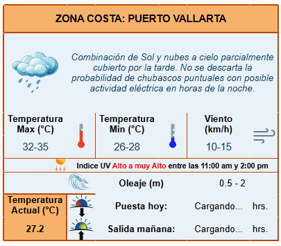 El Servicio Meteorológico Nacional (SMN) indicó esta mañana que, debido a una circulación ciclónica en niveles altos de la atmósfera; el desplazamiento de la onda tropical número 10 sobre el sur y occidente; otro canal de baja presión en el sureste y, el ingreso de humedad del océano Pacífico, golfo de México y mar Caribe: habrá lluvias puntuales intensas —de 75 a 150 milímetros— en el oeste y suroeste de Durango, el centro y sur de Sinaloa, el norte de Nayarit y el occidente de Jalisco. Afectando directamente a Puerto Vallarta. La cadena del clima, Meteored, espera para Puerto Vallarta cielos claros a la mañana, temperaturas que oscilarán de los 30 a los 24 grados centígrados y fuertes ráfagas de viento noreste de 27 km/h.Este miércoles, se prevé que lluvia tormentosa —gotas de 11 mm— cubra hasta el 90% de la región de la ciudad del mar. Las horas más propensas para su caída son: De igual manera, el Instituto de Meteorología y Astronomía (IAM) de la Universidad de Guadalajara, indicó que en el estado de Jalisco se pronostican lluvias desde el centro, pasando por el sur y la costa del territorio. Con información del SMN, IAM y Meteored*Mantente al día con las noticias, únete a nuestro canal de WhatsApp.AO