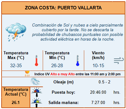 El Servicio Meteorológico Nacional (SMN) indicó que, resultado del ingreso de aire húmedo del golfo de México y mar Caribe; la onda tropical número 10 que se desplazará sobre el Occidente y una nueva onda tropical —la número 11— que se aproximará a la península de Yucatán; habrá lluvias muy fuertes —de 25 a 50 mm— en zonas de Nuevo León, San Luis Potosí, Zacatecas, Aguascalientes, Tamaulipas, Veracruz, y Jalisco, afectando la metrópoli de Puerto Vallarta. La cadena del clima, Meteored, espera para Puerto Vallarta cielos parcialmente nublados a la mañana, temperaturas que oscilarán de los 32 a los 23 grados centígrados y fuertes ráfagas de viento este de 21 km/h.Este jueves, se prevé que chubascos tormentosos —gotas de 3.8 mm— cubran hasta el 90% de la región de la ciudad del mar. Las horas más propensas para su caída son: De igual manera, el Instituto de Meteorología y Astronomía (IAM) de la Universidad de Guadalajara, específico que se esperan lluvias de moderadas a fuertes y puntualmente intensas en regiones del occidente —incluidas las costas de Jalisco— el centro, el sureste y la Península de Yucatán. Con información del SMN, IAM y Meteored*Mantente al día con las noticias, únete a nuestro canal de WhatsApp.AO