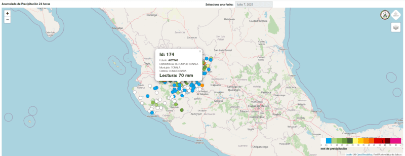 Ayer por la noche, el Área Metropolitana de Guadalajara (AMG) registró presencia de precipitaciones, vientos y actividad eléctrica.El fenómeno climático trajo un nuevo socavón que se formó durante la madrugada de este martes en el cruce de Privada Misioneros y Frailes, en la colonia La Duraznera del municipio de Tlaquepaque. Este sería el segundo socavón de gran magnitud que se forma en el AMG en la misma semana.Además de ello, en la ciudad se registraron diversas inundaciones. Las colonias afectadas en Guadalajara habrían sido San Andrés, Insurgentes, Hormiguero, El Dean, San Carlos; así como Tetlán, Lomas del Paraíso, Quinta Velarde y circunvalación Oblatos.El canal del parque Luis Quintanar en Tetlán sufrió un desborde de su contenido.En este contexto, no es sorpresa que el municipio con mayor cantidad de precipitación acumulada se encuentre dentro del AMG. El día de ayer lunes 8 de julio, de acuerdo con el Acumulado de Precipitación de 24 horas de la Unidad Estatal de Protección Civil y Bomberos de Jalisco reporta que el municipio con mayor caudal de lluvia fue Tonalá con una lluvia puntual muy fuerte que provocó un acumulado de 70 milímetros de agua registrados en la colonia Loma Dorada.Al corte de las 08:00 horas, el municipio con mayor lectura era la capital del estado. Guadalajara reporta un acumulado de 54.8 milímetros leído en la colonia Independencia.* * * Mantente al día con las noticias, únete a nuestro canal de Whatsapp * * *OB