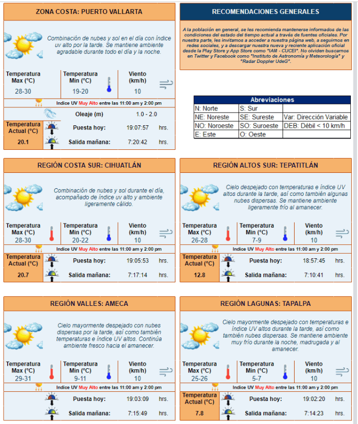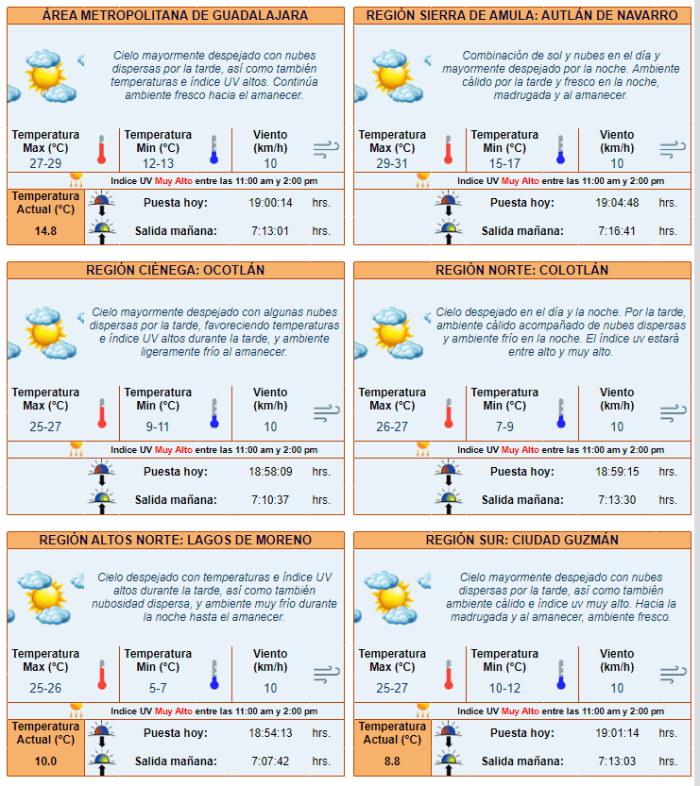 El pronóstico diario del Instituto de Astronomía y Meteorología de la Universidad de Guadalajara, pronostica que para este domingo, Jalisco continúa el cielo mayormente despejado durante el día, dejando temperaturas cálidas e índice UV muy alto en la tarde, sin embargo, se presentarán nubes dispersas al final de la misma.El sistema anticiclónico que se encontraba en el centro y sur de la República Mexicana se ha desplazado más al sur y debilidad, por lo cual, aunque la temperaturas seguirán algo altas en buena parte de los estados del centro, sur y sureste de México, serán notablemente más bajas que los días anteriores.Por su parte, el Servicio meteorológico Nacional pronostica lluvias fuertes en algunos estados del país, mientras que en otros, se espera que el calor alcance temperaturas de hasta los 45 grados. *Mantente al día con las noticias, únete a nuestro canal de WhatsApp aquí: https://whatsapp.com/channel/0029VaAf9Pu9hXF1EJ561i03MV