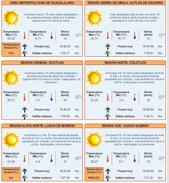 El pronóstico diario del Instituto de Astronomía y Meteorología de la Universidad de Guadalajara, menciona que para este domingo, el Frente Número 30 que se combina con entradas de humedad del Océano Pacífico mantendrá algunas lluvias sobre el litoral del Golfo de México y el sureste del país. Por otro lado, se esperan probables rachas de viento fuertes se esperan en los estados del noroeste, debido a la proximidad de una nuevo frente frío en la zona.Para Jalisco, continuarán las condiciones estables para hoy y el resto del fin de semana, sin probabilidad de lluvia y cielo mayormente despejado. Esto favorecerá temperaturas ligeramente cálidas por la tarde y frías al amanecer, principalmente.Área Metropolitana de Guadalajara:Amanece fresco. El cielo estará despejado y favorecerá ambiente cálido por la tarde y ligeramente frío hacia la noche.Pronóstico por regiones: *Mantente al día con las noticias, únete a nuestro canal de WhatsApp aquí: https://whatsapp.com/channel/0029VaAf9Pu9hXF1EJ561i03MV