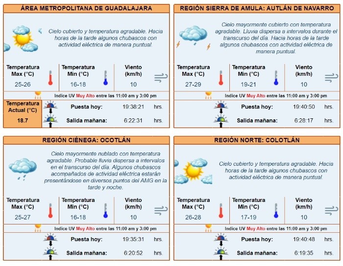 De acuerdo con el pronóstico diario del Instituto de Astronomía y Meteorología de la Universidad de Guadalajara (IAM), el paso de las ondas tropicales 8 y 9 por el Pacífico Mexicano mantendrá lluvias de fuertes a intensas sobre la región Occidente. Mientras que la combinación de canales de baja presión que recorren el interior del país con humedad de ambos litorales dejará lluvias fuertes en región Centro, Sureste y estados del Norte. Para Jalisco se espera un cielo mayormente nublado y temperaturas agradables. Hacia la segunda mitad el día, el crecimiento de las nubes podría generar algún chubasco o tormenta eléctrica de manera dispersa.Para el Área Metropolitana de Guadalajara, se espera cielo cubierto y temperatura agradable. Hacia horas de la tarde algunos chubascos con actividad eléctrica de manera puntual. *Mantente al día con las noticias, únete a nuestro canal de WhatsApp aquí: https://whatsapp.com/channel/0029VaAf9Pu9hXF1EJ561i03 MV