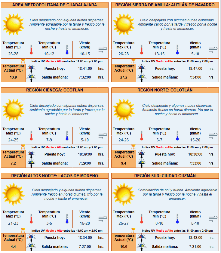 El pronóstico diario del Instituto de Astronomía y Meteorología (IAM) de la Universidad de Guadalajara, pronostica para este día un nuevo frente frío, que avanza por el extremo noroeste de México, específicamente sobre el estado de Baja California.Esta situación traerá un marcado descenso en las temperaturas, así como algunas precipitaciones en zonas montañosas y costeras del Estado. En este sentido, la corriente en chorro polar y subtropical, propiciará fuertes rachas de viento en la región noroeste.Para Jalisco continúa con cielo mayormente despejado y ambiente ligeramente cálido por la tarde, algo frío por la noche y hasta el amanecer, especialmente en Altos y Norte de la entidad.La Zona Metropolitana de Guadalajara (ZMG) tendrá cielo despejado con algunas nubes dispersas, ambiente agradable por la tarde y fresco por la noche y hasta el amanecer.Con información del IAM**Mantente al día con las noticias, únete a nuestro canal de WhatsApp aquí: https://whatsapp.com/channel/0029VaAf9Pu9hXF1EJ561i03MV