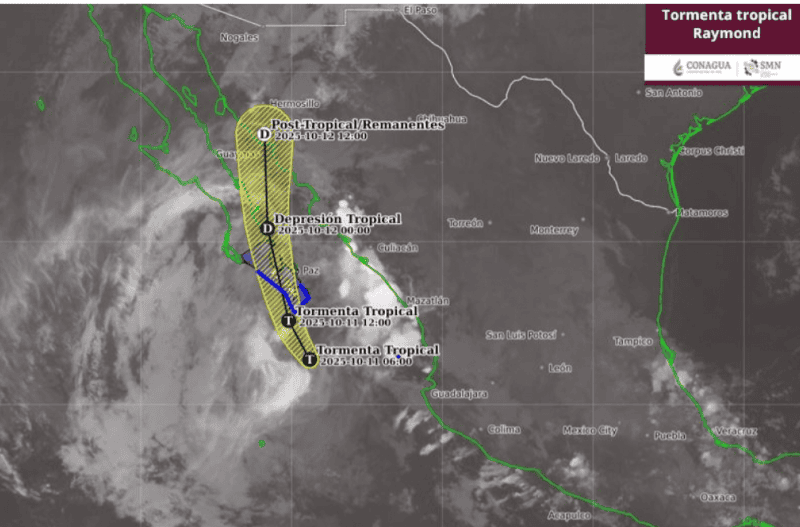 La tormenta tropical "Raymond" mantiene su desplazamiento hacia Baja California Sur, informó la mañana de este sábado 11 de octubre, el Servicio Meteorológico Nacional (SMN), fuente climática oficial del Gobierno de México.El SMN agregó que la tormenta tropical "Raymond" genera lluvias muy fuertes a intensas, rachas de viento y oleaje elevado en Baja California Sur (centro y sur) y Sonora (centro y este).En su distancia al lugar más cercano, el ciclón se encuentra a 175 km al sur-sureste de Cabo San Lucas, Baja California Sur.Su desplazamiento actual es hacia el noroeste (310°) a 26 km/h. Mantiene vientos máximos sostenidos de 75 km/h y rachas de 95 km/h.Se esperan lluvias muy fuertes con puntuales intensas (75 a 150 mm) en Baja California Sur (centro y sur) y Sonora (centro y este). Lluvias fuertes con puntuales muy fuertes (50 a 75 mm) en Chihuahua (oeste y centro), Durango (oeste), Sinaloa y Nayarit. Chubascos con lluvias puntuales fuertes (25 a 50 mm) en Baja California. Todas las lluvias pronosticadas podrían estar acompañadas con descargas eléctricas; reducirán la visibilidad en tramos carreteros y zonas urbanas, asimismo, podrían originar encharcamientos, deslaves, inundaciones y el incremento en los niveles de ríos y arroyos.Se mantiene zona de prevención por efecto de vientos de tormenta tropical desde Los Barriles, hasta Santa Fe, Baja California Sur, así como en las islas Marías, Nayarit.Se prevé viento de 40 a 50 km/h con rachas de 60 a 80 km/h en costas de Baja California Sur (sur). Viento de 30 a 40 km/h con rachas de 50 a 70 km/h en costas de Sinaloa y Nayarit. Y viento de 20 a 30 km/h con rachas de 40 a 50 km/h en Baja California, Sonora (sur) y Chihuahua. Así como oleaje de 2.5 a 3.5 metros de altura en costas de Baja California Sur (sur), Sinaloa y Nayarit; y oleaje de 1.5 a 2.5 metros de altura en costas de Baja California (occidente)."Raymond" en su forma post- tropical / remanentes, estaría en tierra, a 35 km al norte de Guaymas, Sonora mañana domingo 12 de octubre.Autoridades piden extremar precauciones a la población en general en las zonas de los estados mencionados por lluvias, viento y oleaje (incluida la navegación marítima) y atender las recomendaciones emitidas por las autoridades del Sistema Nacional de Protección Civil, en cada entidad.Con información del Servicio Meteorológico Nacional* * * Mantente al día con las noticias, únete a nuestro canal de WhatsApp * * *OA