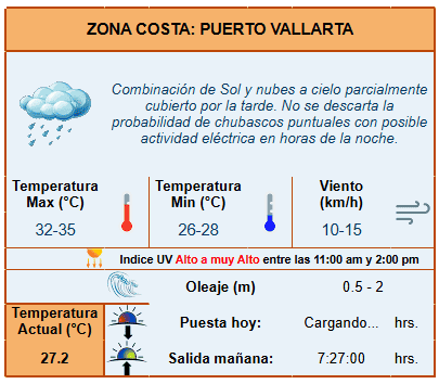 El Servicio Meteorológico Nacional (SMN) indicó que, resultado de la entrada de humedad del océano Pacífico, el golfo de México y el mar Caribe, junto al desplazamiento de la onda tropical número 11 sobre el sureste del país; se pronostican lluvias puntuales muy fuertes —de 50 a 75 milímetros— en Sonora, Chihuahua, San Luis Potosí, Jalisco. Hay posibilidad de que chubascos puedan caer en Puerto Vallarta. Este último día de la semana, en la ciudad del mar no hay lluvias a la vista. De acuerdo con la cadena del clima, Meteored, Puerto Vallarta tendrá un día con muy cielos despejados, temperaturas que oscilarán de los 32 a los 23 grados centígrados y fuertes ráfagas de viento suroeste de 22 km/h. Las temperaturas más cálidas llegarán en las siguientes horas:De igual manera, el Instituto de Meteorología y Astronomía (IAM) de la Universidad de Guadalajara, específico que a raíz del tránsito de una onda tropical frente a las costas del occidente las lluvias caerán de moderadas a fuertes y puntualmente intensas en regiones del occidente, centro, sureste y en la Península de Yucatán. En Jalisco, el cielo permanecerá, sobre todo, nublado, y con posible lluvia tormentosa en diferentes regiones a la tarde. Con información del SMN, IAM y Meteored*Mantente al día con las noticias, únete a nuestro canal de WhatsApp.AO