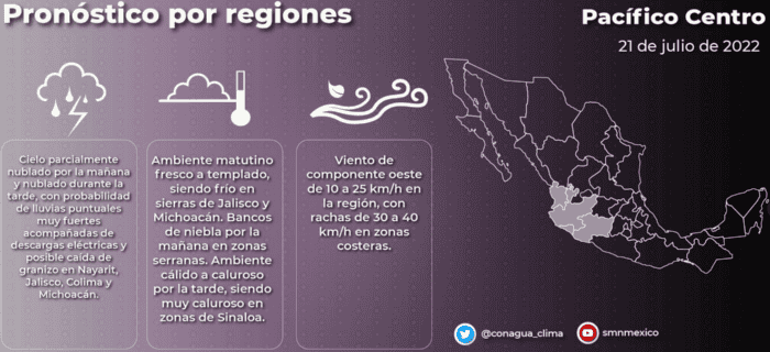 Para este jueves, el paso de la Onda Tropical Número 14 por el Pacífico central mexicano, de la Número 15 por el sur de la Península de Yucatán y la presencia de canales de baja presión sobre el norte, centro, occidente y sur del país, provocarán lluvias muy fuertes en Colima, Guerrero, Jalisco y Michoacán.El Sistema Meteorológico Nacional informó que también habrá lluvias fuertes en Chiapas, Coahuila, Nuevo León, Oaxaca y Zacatecas; chubascos en el Estado de México, Morelos, Quintana Roo, San Luis Potosí, Tabasco y Veracruz, y lluvias aisladas en Aguascalientes, Baja California, Baja California Sur, Campeche, Ciudad de México, Guanajuato, Hidalgo, Puebla, Querétaro, Tamaulipas, Tlaxcala y Yucatán.A su vez, el monzón mexicano en el noroeste del territorio nacional, generará lluvias muy fuertes en Chihuahua, Durango, Sinaloa y Sonora.Las precipitaciones en Chihuahua, Colima, Durango, Guerrero, Jalisco, Michoacán, Nayarit, Sinaloa y Sonora se acompañarán de descargas eléctricas y condiciones para la caída de granizo.En horas de la tarde, se prevé ambiente diurno extremadamente caluroso, con temperaturas superiores a 45 grados Celsius en Baja California, Chihuahua, Nuevo León, Sonora y Tamaulipas; muy caluroso, con temperaturas de 40 a 45 grados en Campeche, Coahuila, Sinaloa y Yucatán; de cálido a caluroso con temperaturas de 35 a 40 grados en Baja California Sur, Chiapas, Durango, Guerrero, Jalisco, Michoacán, Morelos, Nayarit, Oaxaca, Quintana Roo, San Luis Potosí, Tabasco, Veracruz, Zacatecas y el norte y suroeste de Puebla, y con temperaturas de 30 a 35 grados Celsius en Aguascalientes, Colima, Guanajuato, Hidalgo y Querétaro.Se vigila una zona de baja presión en el Océano Pacífico con 10 por ciento de probabilidad para desarrollar un ciclón tropical en 48 horas. Se localiza aproximadamente a 555 kilómetros (km) al sur-suroeste de la desembocadura del río Suchiate, y a 660 km al sur-sureste de Puerto Ángel, Oaxaca. Se desplaza hacia el oeste-noroeste a una velocidad de entre 8 y 16 km/h.OA