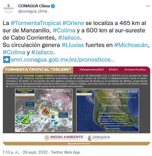 La madrugada de este jueves se formó la tormenta tropical "Orlene", localizada frente a las costas de Jalisco y Colima; reforzará la probabilidad de lluvias puntuales fuertes en el occidente y sur del país, así como rachas fuertes de viento y oleaje elevado en las costas de Jalisco, Colima y Michoacán.El Sistema Meteorológico Nacional informó que el centro de la tormenta tropical "Orlene" se localiza a 470 km al sur de Manzanillo, Colima y a 630 km al sur-sureste de Cabo Corrientes, Jalisco.La circulación de este sistema refuerza el potencial de lluvias en el occidente de México, produciendo chubascos con lluvias puntuales fuertes en Michoacán, Colima y Jalisco, así como viento con rachas de 50 a 60 km/h y oleaje de 1 a 2 metros de altura en las costas de las entidades mencionadas.Se prevé que "Orlene" en las próximas 24 horas suba de intensidad a huracán categoría 1 a 435 km al suroeste de Playa Perula, Jalisco.La masa de aire frío que se impulsó al sistema frontal número 1 cubrirá gran parte del territorio nacional, ocasionando ambiente frío a muy frío con probabilidad de heladas en zonas altas de los estados del norte, centro y oriente de México.También, se prevé que un evento de "Norte" muy fuerte en las costas de Veracruz, Istmo y Golfo de Tehuantepec, así como fuerte en las costas de Tamaulipas, Tabasco y Campeche.Además, existe la probabilidad de lluvias puntuales muy fuertes en zonas de Veracruz, Oaxaca y Chiapas, y lluvias fuertes en zonas de Tabasco.Por su parte, una circulación de baja presión en el noroeste de la República Mexicana producirá lluvias puntuales fuertes, acompañadas de descargas eléctricas y posible caída de granizo en dicha región, así como lluvias con chubascos en la Península de Baja California.OA
