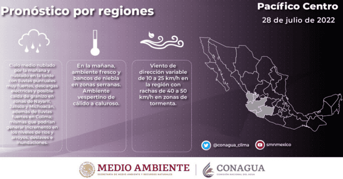 Para el Valle de México se prevé que por la tarde habrá cielo nublado, viento de dirección variable de 10 a 20 km/h, ambiente cálido, descargas eléctricas, rachas de viento de hasta 45 km/h y condiciones para la caída de granizo en zonas con lluvia.