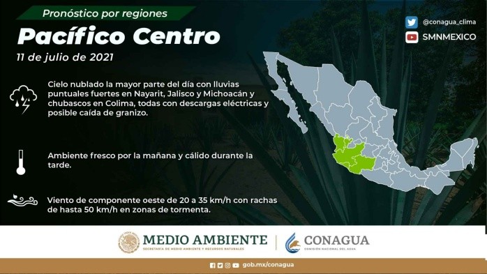Para este domingo 11 de julio en Jalisco se prevé cielo nublado durante la mayor parte del día con lluvias puntuales fuertes, todas con descargas eléctricas y posible caída de granizo, así lo informó el Servicio Meteorológico Nacional (SMN).Las regiones Central Ciénega, Sur y Sureste tendrán cielo nublado con lluvias puntuales muy fuertes, mientras que en Los Altos, y las regiones Norte, y Valles se prevén lluvias puntuales fuertes. Se espera que las precipitaciones, que estarán acompañadas de actividad eléctrica y caída de granizo, se registren durante la tarde de este domingo, pero podrían continuar por la madrugada y las primeras horas de mañana.Esto se debe al canal de baja presión que se extenderá sobre el noroeste, occidente y centro del país, que ocasionará “chubascos y lluvias fuertes a muy fuertes, descargas eléctricas y posibles granizadas” en estas zonas del país.El Instituto de Astronomía y Meteorología de la UdeG pronostica que este domingo habrá presencia de nubes y sol en la Zona Metropolitana de Guadalajara (ZMG), y se registrará “lluvia significativa”.