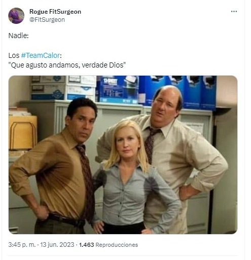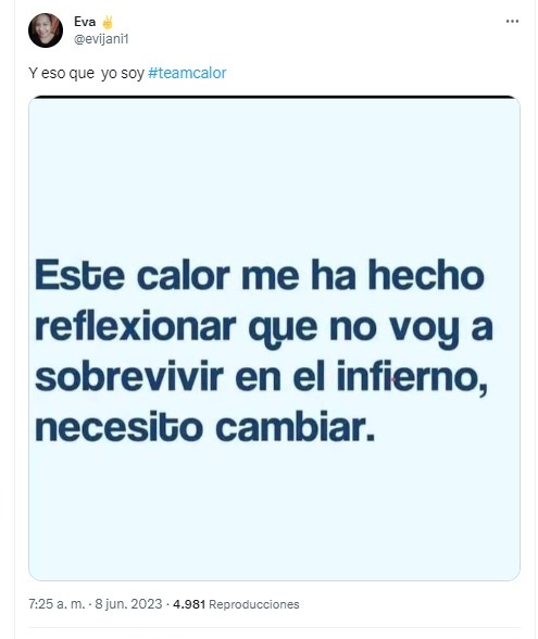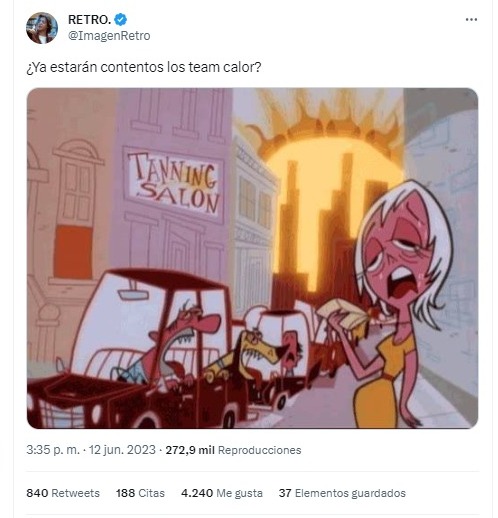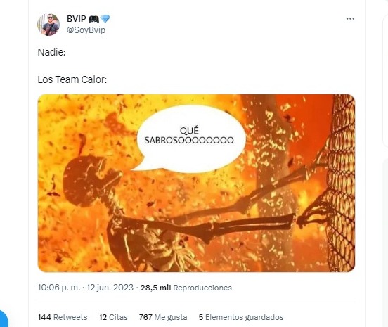 El calor sigue imparable en la Zona Metropolitana de Guadalajara y este día martes logró un nuevo récord histórico al llegar a 37.9 grados Celsius.Ante esta situación, es que los cibernautas no desaprovecharon el momento para tomarlo con humor y hacer memes de quienes prefieren el calor, incluso, hicieron tendendencia el #TeamCalor.Cabe recordar que debido a la tercera ola de calor que azota en el país, e incluso, se esperan temperaturas en algunos estados de 45 grados celsius.No olvides para evitar un golpe de calor mantenerse hidratados, de preferencia con agua natural, y evitar los lugares concurridos donde se concentre el calor. El sábado 17 de junio se espera cielo parcialmente cubierto, probabilidad de tormenta.