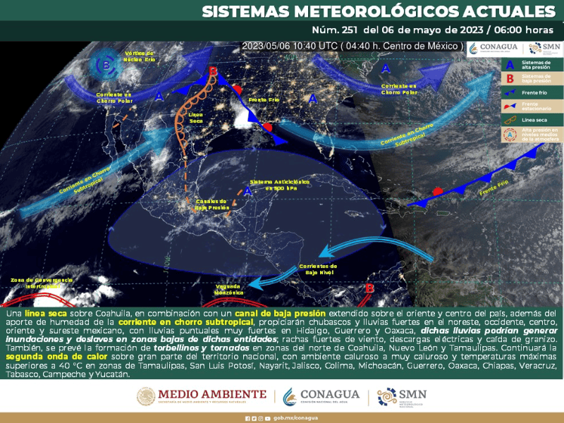 Este sábado 6 de mayo de 2023, el Servicio Meteorológico Nacional (SMN) pronostica que la segunda onda de calor sobre gran parte del territorio nacional, con ambiente caluroso a muy caluroso y temperaturas máximas superiores a 40 °C, afectará zonas de Tamaulipas, San Luis Potosí, Nayarit, Jalisco, Colima, Michoacán, Guerrero, Oaxaca, Chiapas, Veracruz, Tabasco, Campeche y Yucatán.Además, una línea seca sobre Coahuila, en combinación con un canal de baja presión extendido sobre el oriente y centro del país, además del aporte de humedad de la corriente en chorro subtropical, propiciarán chubascos y lluvias fuertes en el noreste, occidente, centro, oriente y sureste mexicano, con lluvias puntuales muy fuertes en Hidalgo, Guerrero y Oaxaca, dichas lluvias podrían generar inundaciones y deslaves en zonas bajas de dichas entidades; rachas fuertes de viento, descargas eléctricas y caída de granizo. También, se prevé la formación de torbellinos y tornados en zonas del norte de Coahuila, Nuevo León y Tamaulipas.En su reporte por regiones, el SMN indica que para el Pacífico Centro se espera cielo nublado con chubascos en Michoacán, lluvias aisladas en Jalisco y Colima, y sin lluvia en Nayarit. Ambiente fresco por la mañana y extremadamente caluroso durante la tarde en la región. Viento de componente oeste con rachas de 40 a 60 km/h en Jalisco.Las lluvias muy fuertes podrían generar inundaciones y deslaves en zonas bajas de Hidalgo, Guerrero y Oaxaca.OF