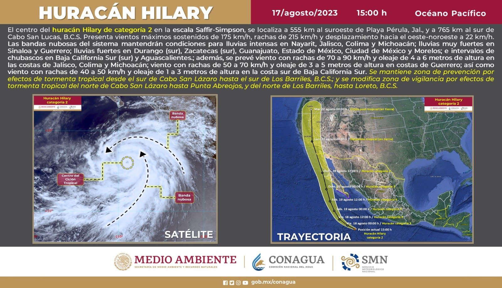 El Huracán Hilary surgió el miércoles como tormenta tropical y se ha intensificado, pues ha alcanzado categoría 2 en la escala Saffir-Simpson este jueves. De acuerdo al pronóstico elaborado por el Servicio Meteorológico Nacional (SMN) podría alcanzar el nivel 4.El pronóstico del SMN prevé que esta misma tarde, "Hilary" alcance la categoría 4 como huracán, cuando se encuentre a 570 kilómetros al suroeste de Playa Pérula, Jalisco y a 595 kilómetros al suroeste de Cabo Corrientes, Jalisco.Actualmente "Hilary" mantiene la categoría 2 como huracán y sus extensas bandas nubosas provocan lluvias de fuertes a puntuales intensas en estados del occidente, centro y sur de México.Se espera que el huracán toque tierra entre los límites de Baja California Sur y Baja California; sin embargo sí tendrá impacto con precipitaciones muy fuertes en Colima, Jalisco, Nayarit, Puebla, Ciudad de México, Estado de México y Morelos.Debido a que la trayectoria del Huracán Hilary es por la costa del Pacífico mexicano hasta la península de Baja California Sur, hay una alta probablidad de que en el Área Metropolitana de Guadalajara tenga impacto, pues la Conagua alerta sobre lluvias muy fuertes (de 50 a 75 milímetros), así como rachas de viento de 50 a 70 km/h.El pronóstico estima que Hilary tocará tierra el lunes, al llegar al estado de California, Estados Unidos, ya como tormenta tropical.