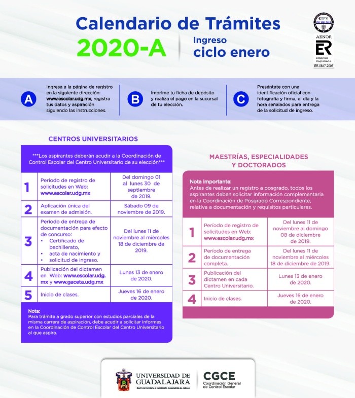 De nueva cuenta, la Universidad de Guadalajara (UdeG) publicará exclusivamente vía Internet los resultados del examen de admisión para Licenciaturas y Posgrados. En julio de 2019, la Casa de Estudios tomó la determinación de que la consulta fuera solamente virtual y generó un ahorro de 700 mil pesos.Desde el primer minuto del lunes 13 de enero estarán en línea los resultados de quienes ingresarán a la Universidad de Guadalajara para el calendario 2020-A que inicia clases el jueves 16 de enero de 2020.La primera opción para consultar estos resultados, es a través de los sitios oficiales de la Universidad de Guadalajara: escolar.udg.mx, o udg.mx Sin embargo, debido a la alta demanda de consultas, estos sitios pueden tener demoras o fallas.Para facilitar el acceso y como servicio a la comunidad universitaria, EL INFORMADOR replicará los resultados oficiales en el sitio especial www.informador.mx/listas-udg (a partir de las 00:00 horas del 13 de enero). Para utilizar el servicio sólo debes ingresar el código de registro para saber el resultado de admisión.Otras opciones para consultar los resultados oficiales de la UdeG por internet son los sitios del SIIAU (Sistema Integral de Información y Administración Universitaria), y el de La Gaceta de la Universidad de Guadalajara.Quienes fueron aceptados para ingresar a algún plantel de la UdeG deberán consultar los siguientes pasos en el sitio escolar.udg.mx y presentarse en las escuelas en las que fueron admitidos para completar los procedimientos de inscripción.El primer día de clases será el jueves 16 de enero de 2020 para preparatorias, licenciaturas, maestrías, especialidades y doctorados de la Universidad de Guadalajara.Si no fuiste admitido a la carrera que hiciste trámites, debes saber que la UdeG ofrece algunos cupos disponibles para otras carreras que se anunciarán en los sitios oficiales y redes sociales de la Universidad. De otra manera deberás retirar tus documentos para volverlo a intentar próximamente.Ya no imprimir las listas de admitidos en la Universidad de Guadalajara (UdeG) era un paso que se tenía que dar debido a que “en los últimos ciclos vimos que ya no había tanta demanda de La gaceta. No ha pasado nada, porque las nuevas generaciones viven con la tecnología”, dijo Roberto Rivas Montiel, coordinador general de Control Escolar.Para el calendario 2019-B, cuyos resultados se difundieron en junio pasado, el rector Ricardo Villanueva, informó que el equipo técnico de la Universidad laboró en optimizar el funcionamiento de los sistemas y servidores para recibir el tráfico de consultas. Pidió a los aspirantes que preferentemente lo revisen después del “pico” de consultas de los primeros minutos de la jornada, que suele darse alrededor de la medianoche, pues no habrá problemas para consultar a lo largo del día. Añadió que los aspirantes que no tengan acceso internet pueden acudir al campus más cercano para poder consultar el dictamen. Reiteró que las listas ya no se imprimirán y no estarán en los ingresos de los centros escolares.SR