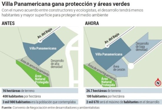 El convenio entre los desarrolladores de la Villa Panamericana y los ambientalistas logró que se redujera la población que vivirá en el complejo ubicado en la zona de El Bajío.Esto gracias a que se aumentó la superficie del proyecto y se modificó a la baja la densidad en un área que antes se destinaba a comercios y servicios con permisos de alta densidad poblacional, explicaron Salvador Cosío de Conciencia Cívica y Alejandro Cárdenas del Parlamento de Colonias.También el acuerdo obliga a que el Área Natural Protegida sea liberada.Adicionalmente se logró el compromiso de los desarrolladores de cumplir las 56 condiciones que impone la Autorización Condicionada en Materia de Impacto Ambiental y a la creación del Instituto de Monitoreo del Ciclo del Agua y Ambiental.Otro tema sustancial es el respeto irrestricto al plan parcial vigente que es el del 2008, lo que deja sin construir cerca de 100 mil metros del predio, y se utilizará solo para fines de equipamiento y no habitacional en cerca de 10 hectáreas.Esto significa que no tendrá uso habitacional y respetará y dejará libres de edificación las áreas de infiltración y cauces naturales de arroyos para protección del acuífero.GC