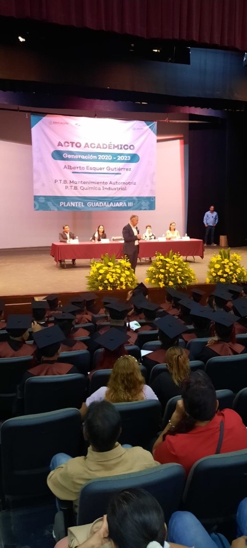 En un emotivo evento llevado a cabo en el Foro de Arte y Cultura, el plantel Conalep Guadalajara III celebró el acto académico de su generación 2020 – 2023.La Lic. Paulina Corella Gómez, directora del plantel, junto con el Lic. Alberto Esquer Gutiérrez, padrino de la generación, fueron los anfitriones de esta ceremonia.Alberto Esquer en su mensaje a los graduados y al público instó a los estudiantes a atreverse a buscar su sueño y ser disciplinados.“Atrévanse a soñar, y buscar el éxito, no se conformen, sean constantes y disciplinados para triunfar en todos los ámbitos de su vida”, señaló.Además, aprovechó la ocasión para agradecer y reconocer el arduo trabajo de los padres de familia y las autoridades escolares, cuyo apoyo fue fundamental para el desarrollo académico de los alumnos.El evento contó con la presencia de la maestra Guadalupe Suárez Trejo, en representación de la secretaría de educación, y el ingeniero Mario González Frías, Gerente de Bosch MaP y presidente del comité de vinculación, quienes ofrecieron palabras de aliento y apoyo a los graduados.La atmósfera festiva del acto académico estuvo animada por el grupo Sax y Voces, quienes deleitaron a todos los presentes con varias intervenciones musicales a lo largo del evento.En este evento se graduaron 110 alumnos de las carreras Profesional Técnico Bachiller (P.T.B) Mantenimiento Automotriz y P.T.B. en Química Industrial. Cada uno de ellos recibió un detalle representativo de parte del padrino de generación, Alberto Esquer Gutiérrez, como reconocimiento a su esfuerzo y dedicación durante su trayectoria educativa en el Conalep Guadalajara III.De igual forma la generación correspondió con un detalle artístico creado por el alumno Kevin Uriel De Anda Ibarra en un portaretratos de los artistas jaliscienses Claudia Ríos y Julio Michel.La culminación del evento llegó con la toma de protesta por parte de la dirección General de Conalep Jalisco.MF