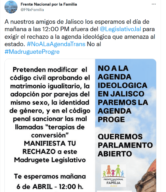 El Congreso de Jalisco amaneció cercado este miércoles debido a las posibles manifestaciones que se registrarán a lo largo del día, ya que se tiene previsto que los legisladores voten tres iniciativas, entre ellas la aprobación del matrimonio igualitario.La Policía Vial informó, a través de Twitter, del cierre de las calles aledañas al Congreso, como Independencia, en su cruce con Pino Suárez y Belén. Además, en los alrededores hay fuerte presencia de elementos policiales.Además de discutir sobre las reformas para incluir en el Código Civil de Jalisco el matrimonio entre personas del mismo sexo, también debatirán sobre la prohibición de las terapias de conversión y la propuesta de identidad de género para que las personas transgénero puedan legalizar sus documentos oficiales.Grupos en contra de esta iniciativa, como Frente por la Familia, anunciaron que se manifestarán a las 12:00 pm afuera del Congreso de Jalisco para "exigir el rechazo a la agenda ideológica".Mientras que colectivos en favor de la comunidad LGBT, hicieron un llamado a manifestarse de manera pacífica afuera del recinto, a las 16:00 horas, vistiendo de color amarillo y así exigir a los legisladores que aprueben los matrimonios igualitarios. GC